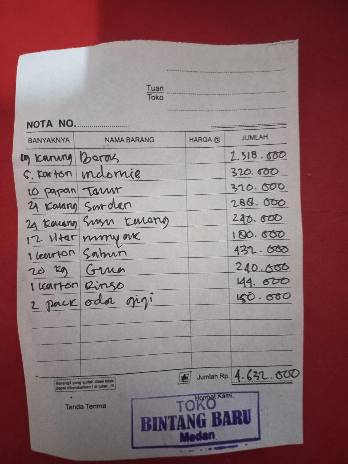 Dana digunakan untuk 1. Beras mawar 10 kg 122.000 x 19 karung= Rp2.318.000 2. Mie instan 42.000 x 5 karton= Rp320.000 3. Telur 32.000 x 10 papan= Rp320.000 4. Sarden 12.000 x 24 kaleng= Rp288.000 5. Susu kaleng 10.000 x 24 kaleng = 240.000 6. Minyak Bimoli 15.000 X 12 liter= Rp180.000 7. Sabun Lifebuoy 1 karton Rp432.000 8. Gula 12.000 x 20 kg= Rp240.000 9. Rinso Daia 1 karton Rp144.000 10. Odol gigi 2 pack Rp150.000.2023-06-07 16:10:22
