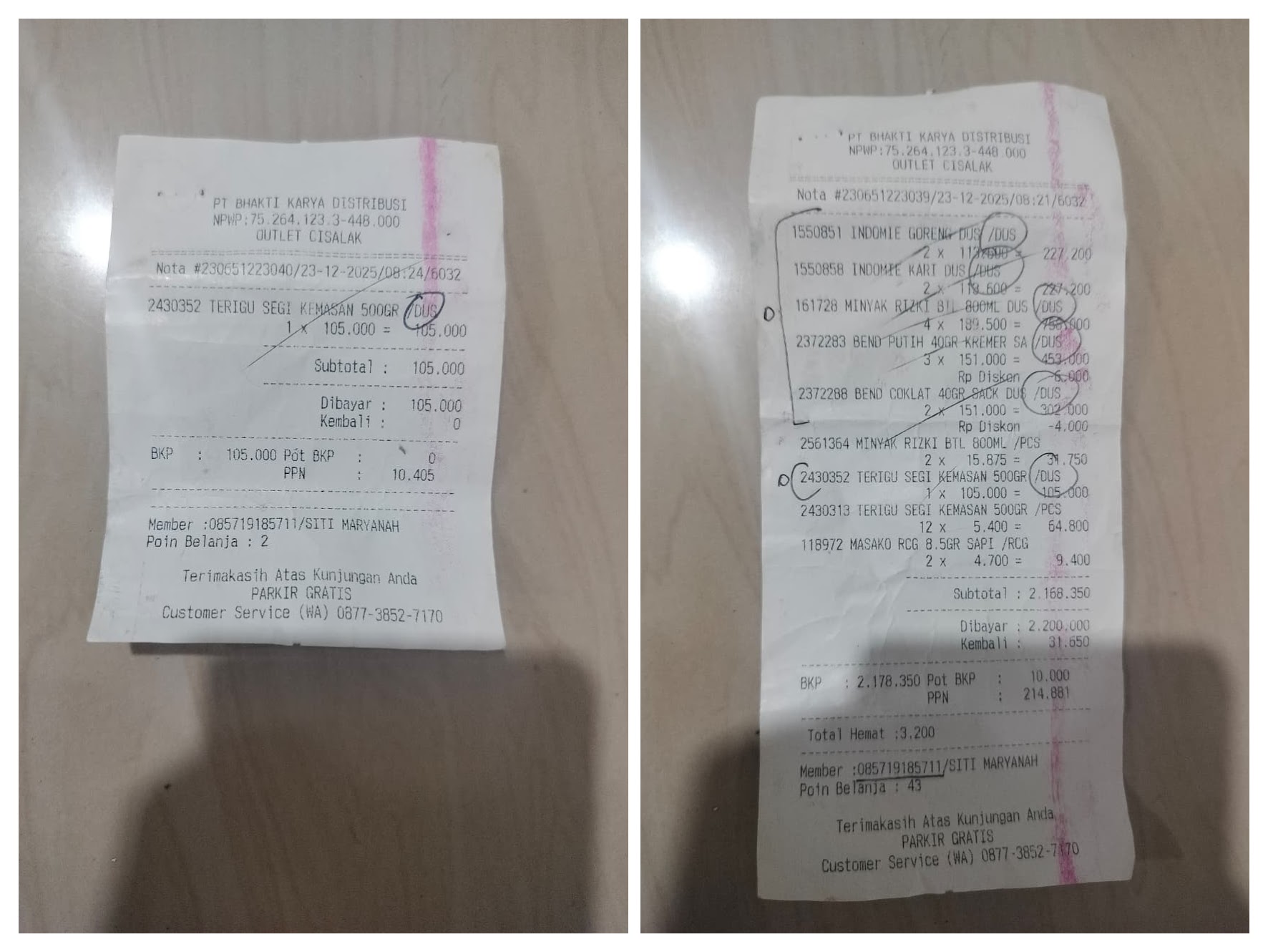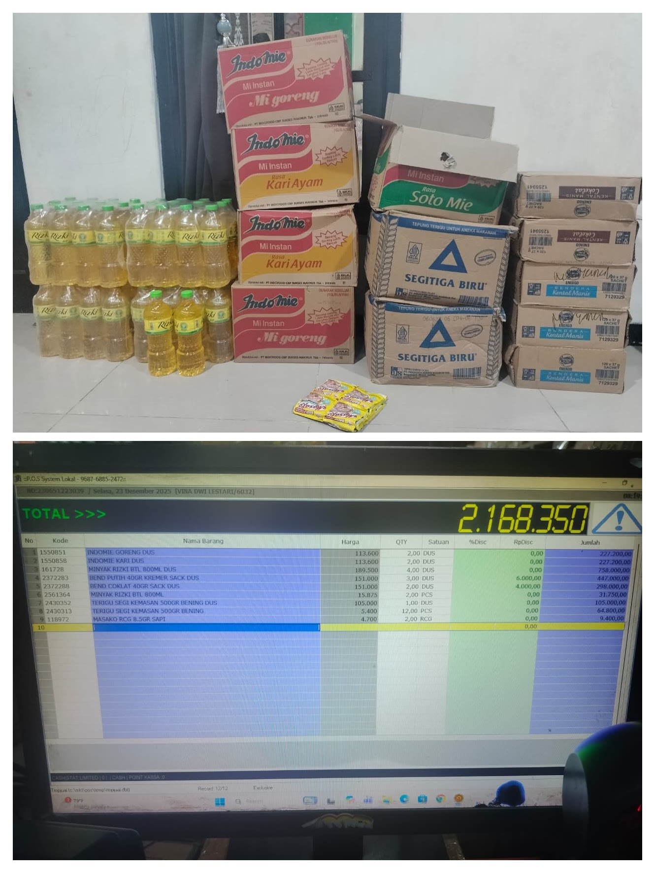 - 22 pcs Minyak Goreng (2 Liter) = Rp 880.000 - 42 pcs Gulaku (1 Kg) = Rp 840.000 - 5 pcs Teh (10 box) = Rp 175.000 - 62 pcs Tepung Terigu (1 kg) = Rp 744.000 - Transportasi = Rp 23.3702024-09-10 14:05:13