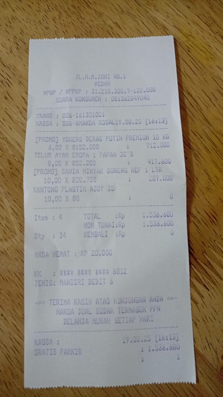 Dana digunakan untuk 1. Beras Rp15.000 x 60kg = Rp900.000 2. Telur Rp40.000 x 10 papan = Rp400.000 3. Minyak makan/goreng Rp18.000 x 12pcs = Rp216.0002025-08-19 11:25:53
