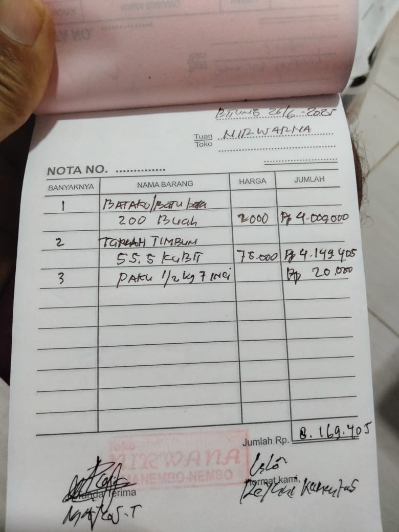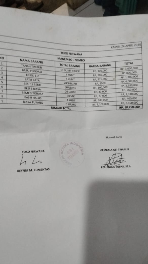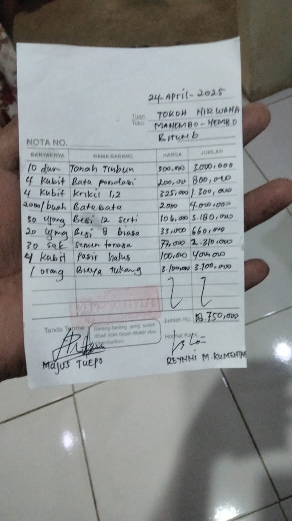 1. Krikil 3 kubik x 375.000 = 1.125.000 2. batu pondasi 4 kubik X 200.000 = 800.000 3. Pasir 4 kubik X 100.000 = 400.000 4. Besi 12 inci super 48 ujung X 60.000 = 2.880.000 5. Besi 8 inci 20 ujung X 20.000 = 400.000 6. Kawat bendrat 2 kg X 25.000 = 50.000 7. Paku 7 inci + paku 10 inci 5 X 15.000 = 75.000 8. Paku tripleks 1 kg 25.000 = 25.000 9. Tripleks 9 mili 8 lbr X 100.000 = 800.000 10. Kayu lata 5x7 cm x 4 m 29 ptg X 25.000 = 725.000 11. Papan mall 2,5 X 25 cm X 4 m 102024-05-28 10:09:11
