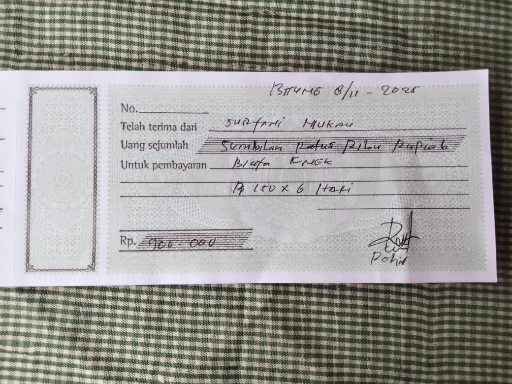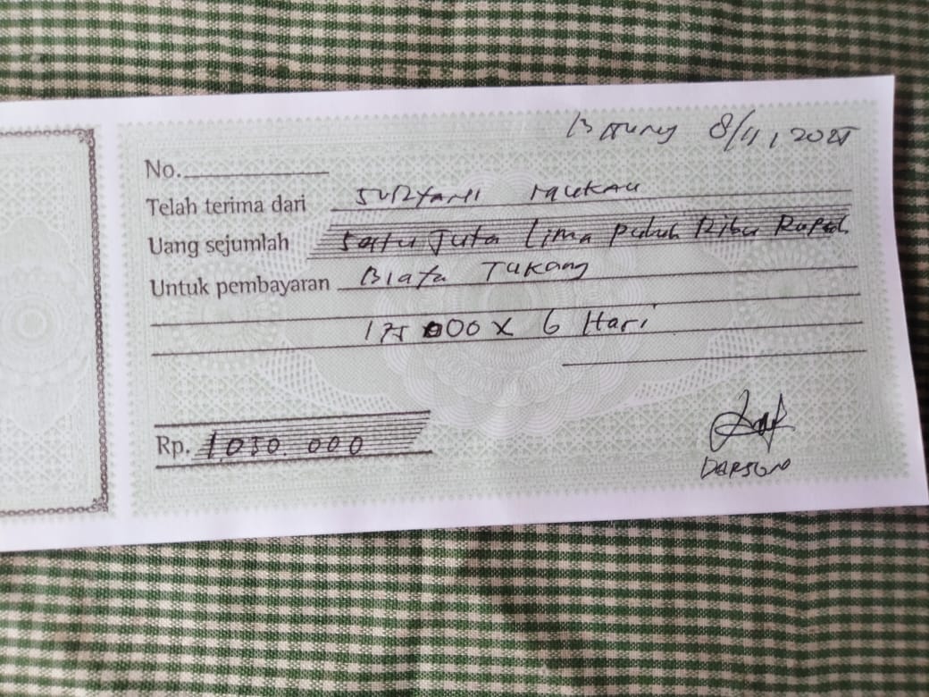 Dana digunakan untuk 1. Pembayaran tukang Rp150.000 x 6 hari = Rp900.000 2. Pembayaran tukang Bass Rp175.000 X 6 hari = Rp1.050.0002025-11-06 10:28:34