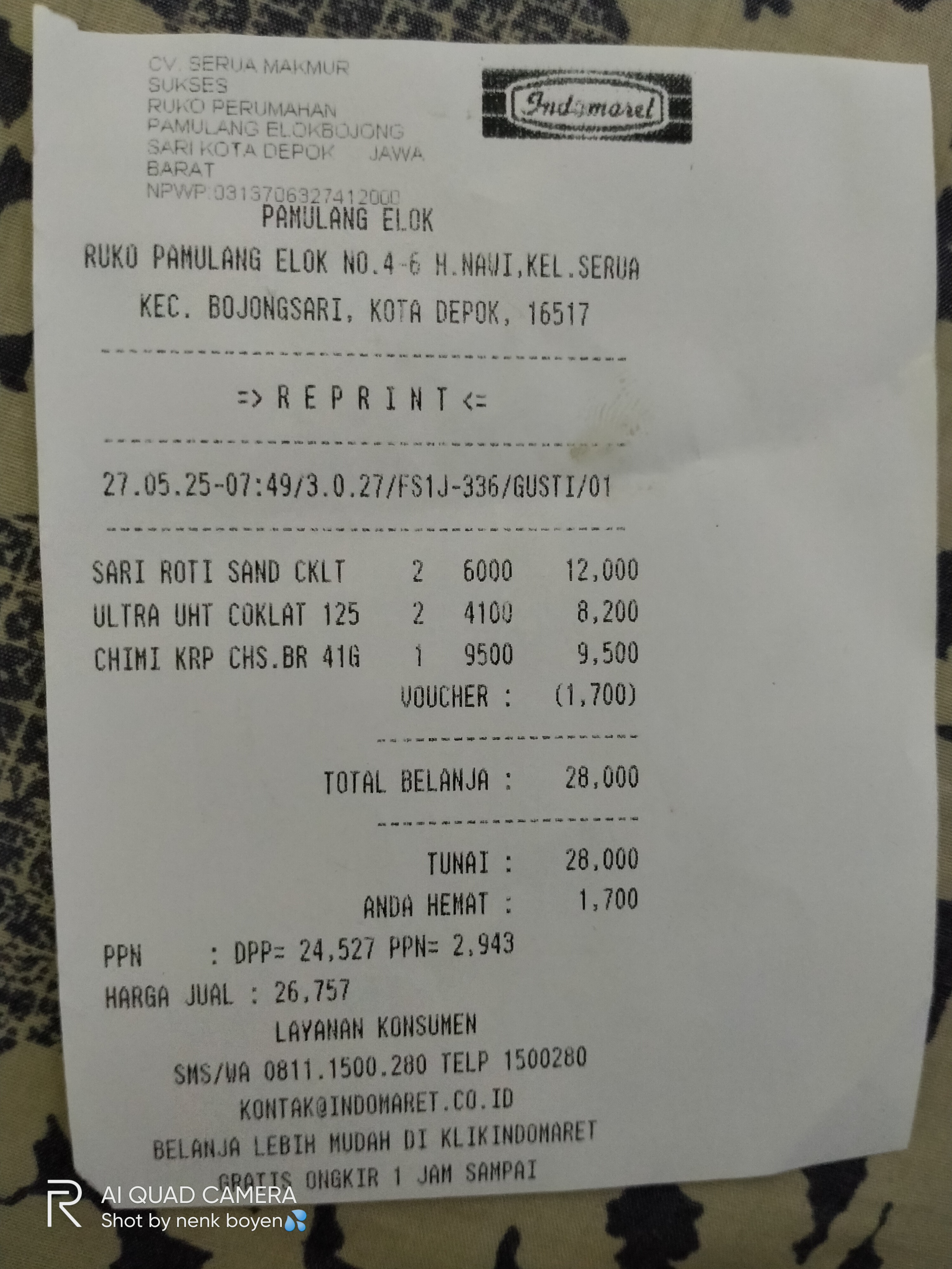 Dana digunakan untuk 1.Transportasi bensi ke RSUD pada tanggal 27 Mei 2025 Rp30.000 2.Konsumsi febrian selama di RS Rp30.000 3.Susu dancow fartigrow 2kg Rp226.0002025-05-27 10:05:40