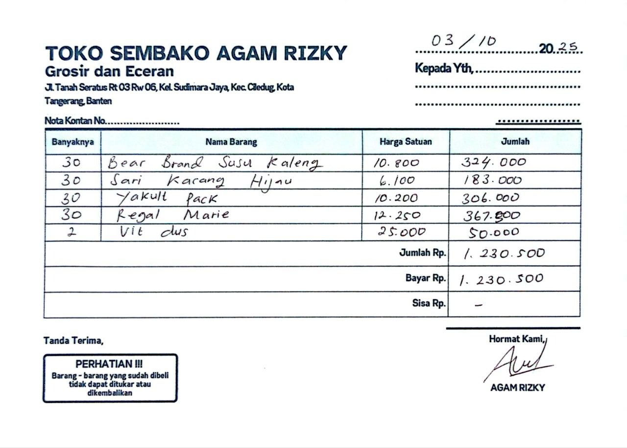 Dana digunakan untuk Dana digunakan untuk: 1. Yakult Rp 10.200 x 30 pack = Rp 306.000 2. Bear Brand Rp 10.800 x 30 kaleng = Rp 324.000 1 3. Sari Kacang Ijo Rp 6.100 х 30 рes = Rp 183.000 4. Biskuit Roma Rp 12.250 x 30 bungkus = Rp 367.500 5. Apel Rp 9.543 x 30 buah = Rp 286.300 6. Tas Bening Rp 3.500 x 30 pcs = Rp 105.000 7. Amplop Santunan Rp 50.000 x 30 orang = Rp 1.500.000 8. Air Gelas Rp 25.000 x 2 dus = Rp 50.0002025-09-26 10:10:54