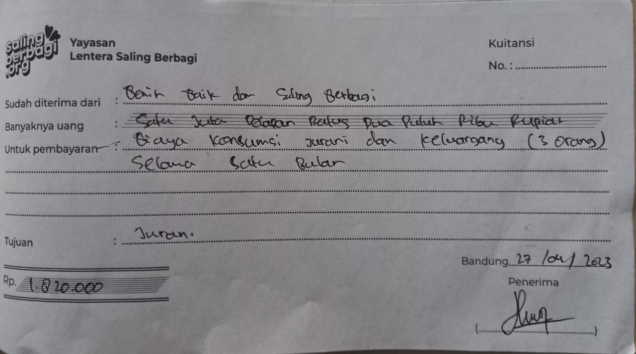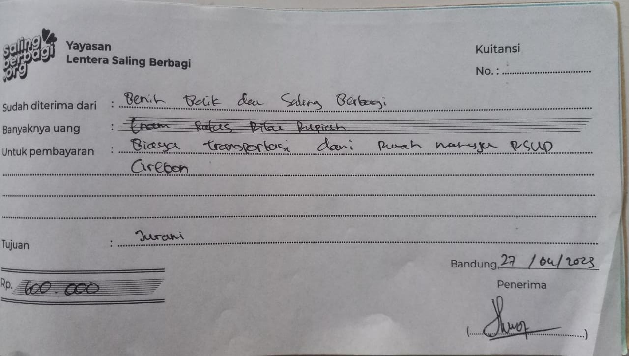 Dana digunakan untuk 1. Biaya transportasi angkutan umum pulang-pergi ke RSUD Cirebon Rp600.000 2. Pembelian sembako Rp900.000 3. Biaya makan selama pengobatan untuk 3 orang (4 minggu) Rp1.818.633.2023-04-17 19:47:46
