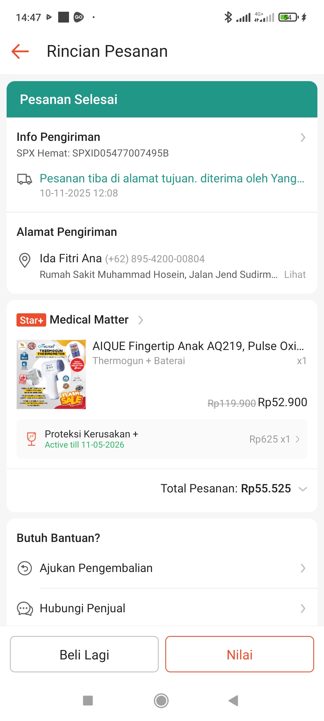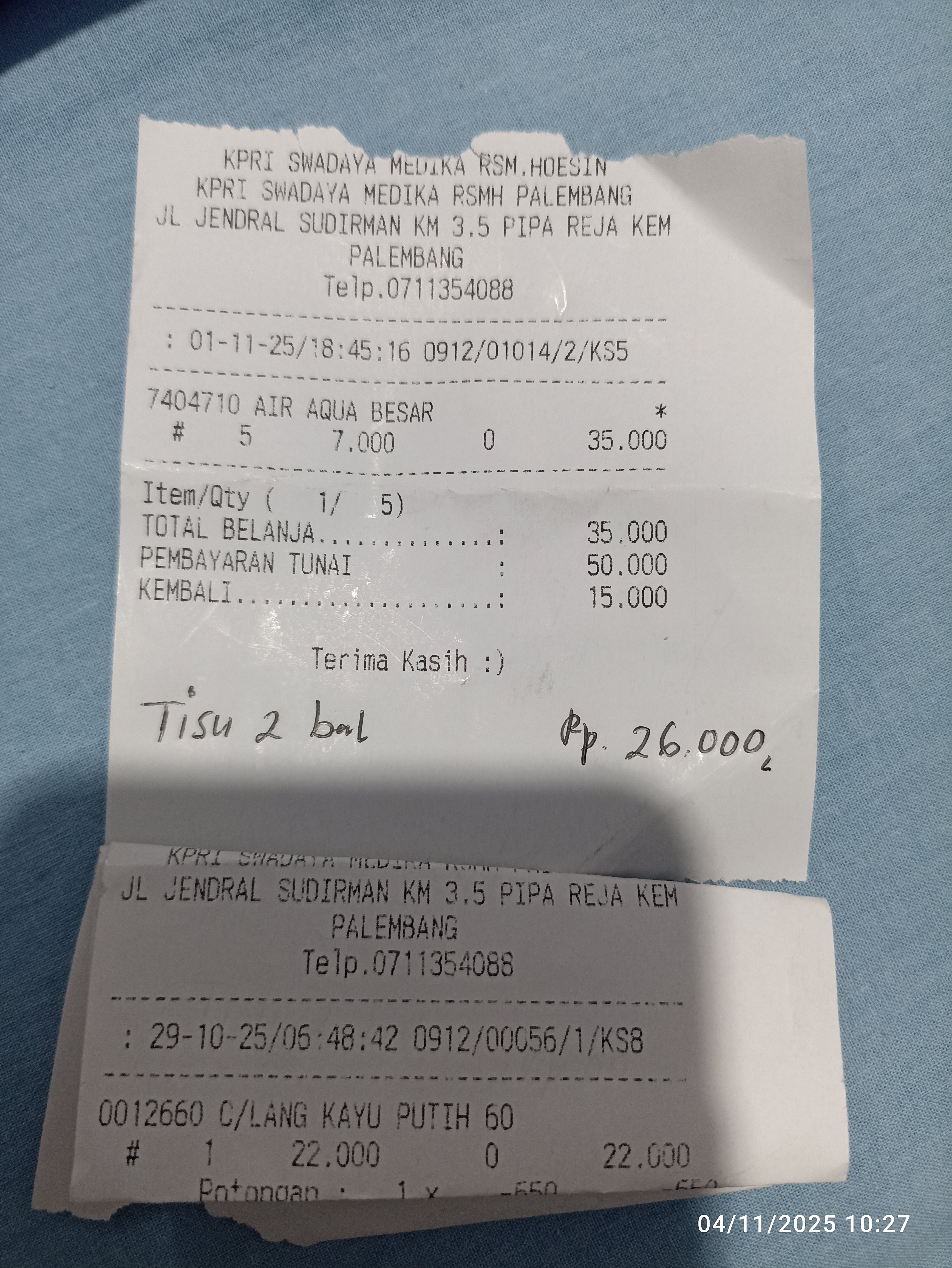 Dana digunakan untuk 1. Oxmoneter fingerprint Rp50.000 2. Termometer digital Rp30.000 3. Perban hevapix Rp35.0002025-10-02 07:11:00