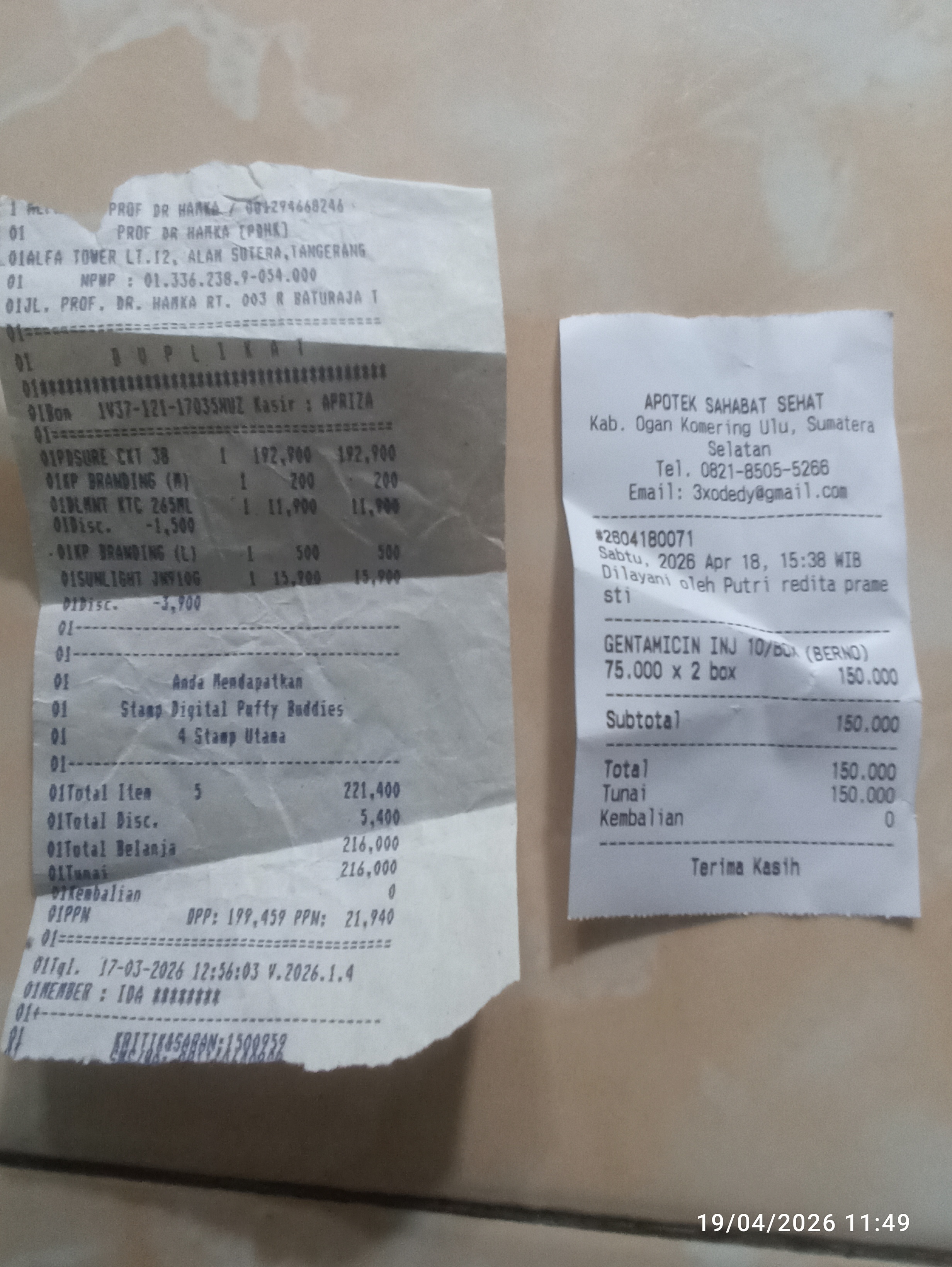 Dana digunakan untuk 1. Tranportas mobil travel kontrol ke palembang Rp300.000 2. Alkoholik sweb 2 kotak x Rp30.000 = Rp60.000 3. Antibiotik gentamisin 20 ampul x Rp8.000 = Rp160.000 4. Susu pediasur 400 gram Rp195.000 5. Tensi meter anak digital Rp300.0002026-02-27 10:00:12