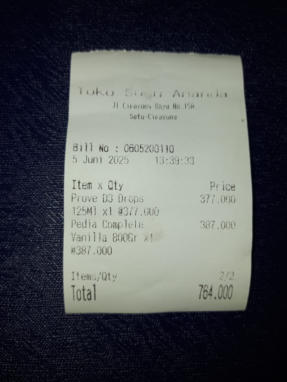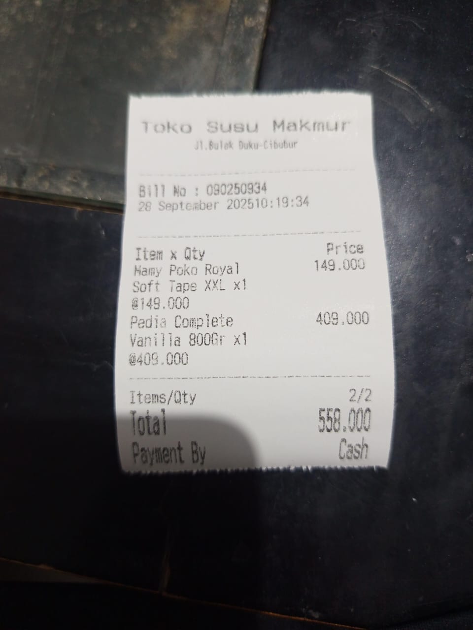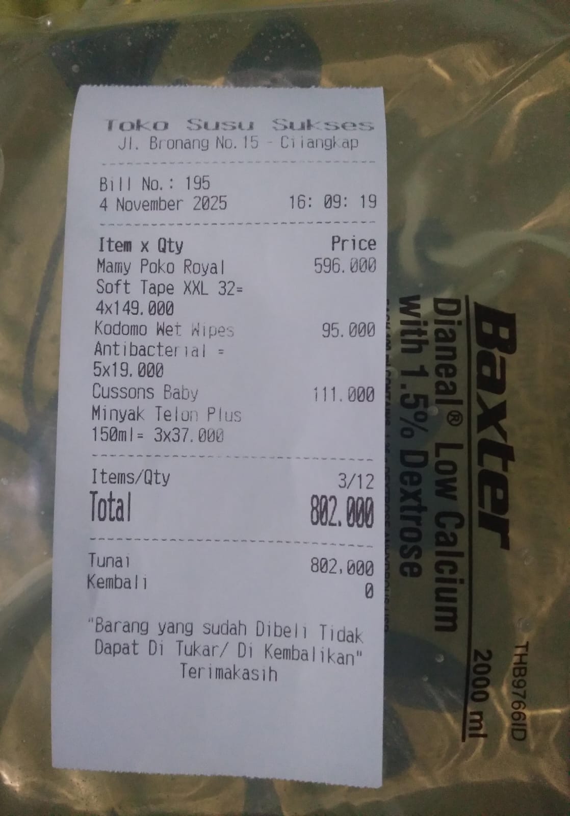 1. Calnic Plus Suspensi 100 ml Rp 125.520 ×3 = Rp 376.560 2. Prove D3 Drop Rp 364.320 3. Mamy Poko Royal Soft Tape XXL 32 Rp140.880×4 = Rp563.520 4. Pediasure Complete Rp440.000 × 4 = Rp 1.760.000 5. Kodomo Wet Wipes Antibacterial Rp 17.900×5 = Rp 89.500 6. Cussons Baby Minyak Telon Plus 150ml Rp 35.200× 3 =Rp105.600 7. Minyak Zaitun Rafael Salgado Extra Virgin Olive Oil 250 ml Rp155.000x2= Rp 310.000 8. Kasa Steril One Med 5x7 16 ply Rp10.250× 60= Rp 615.000 --2025-12-03 14:11:25