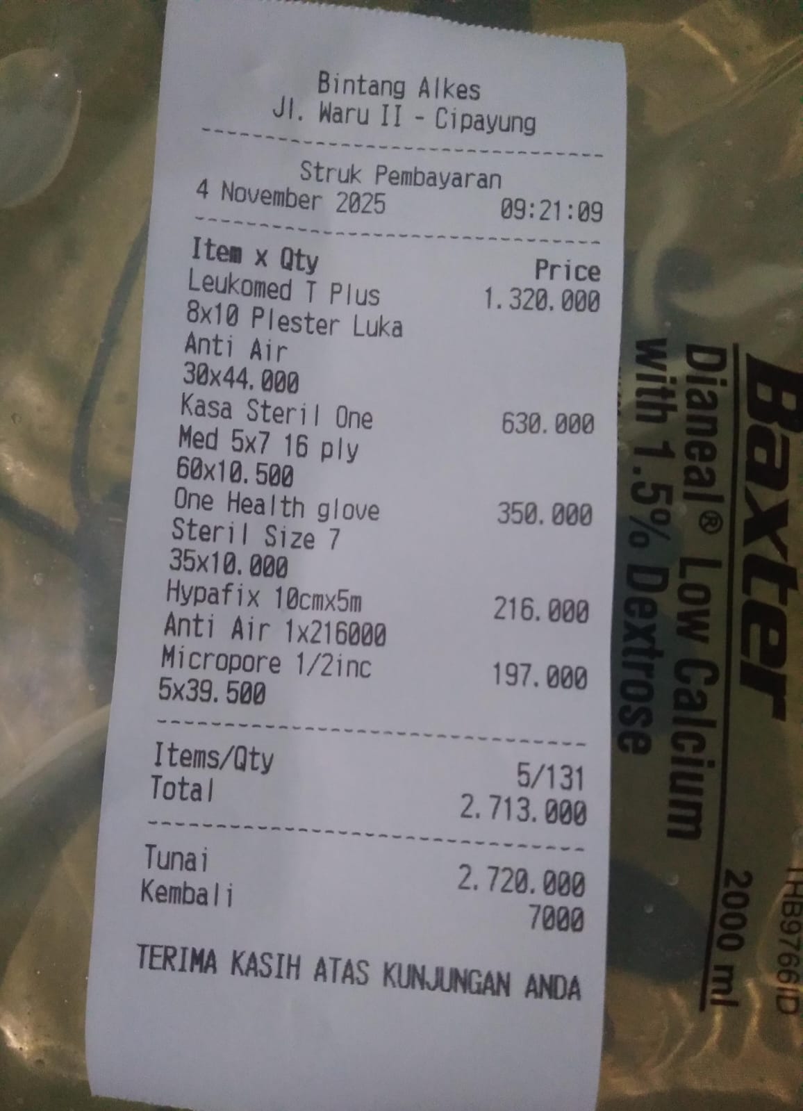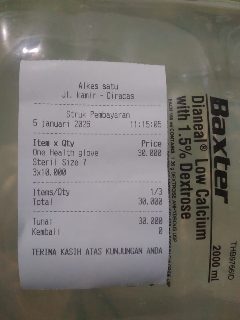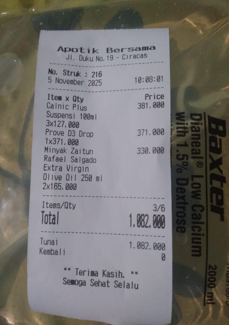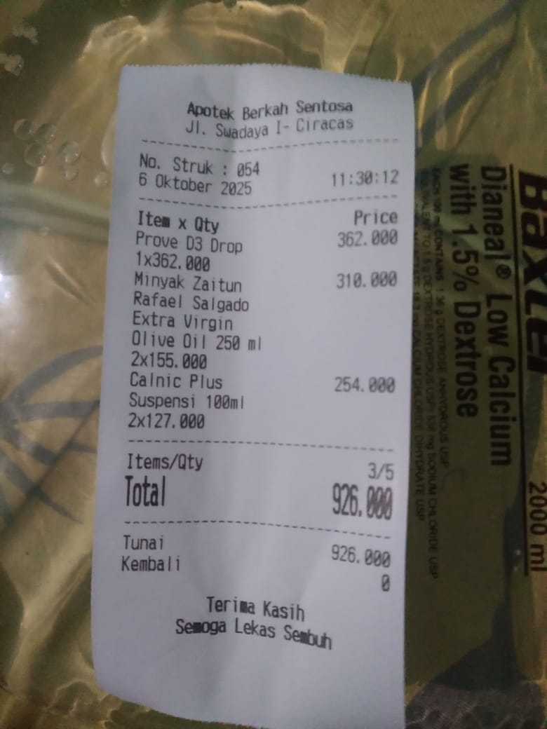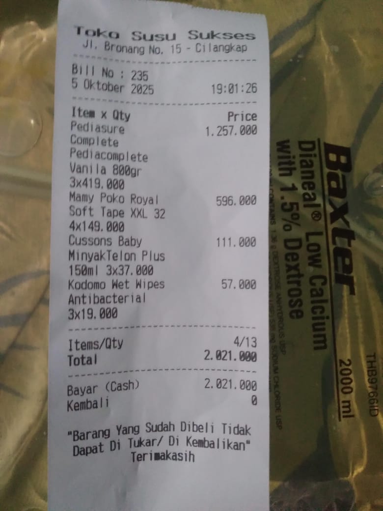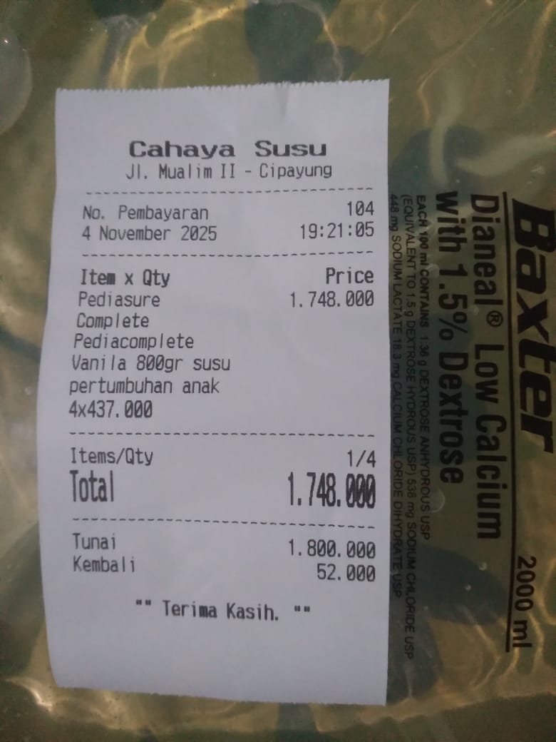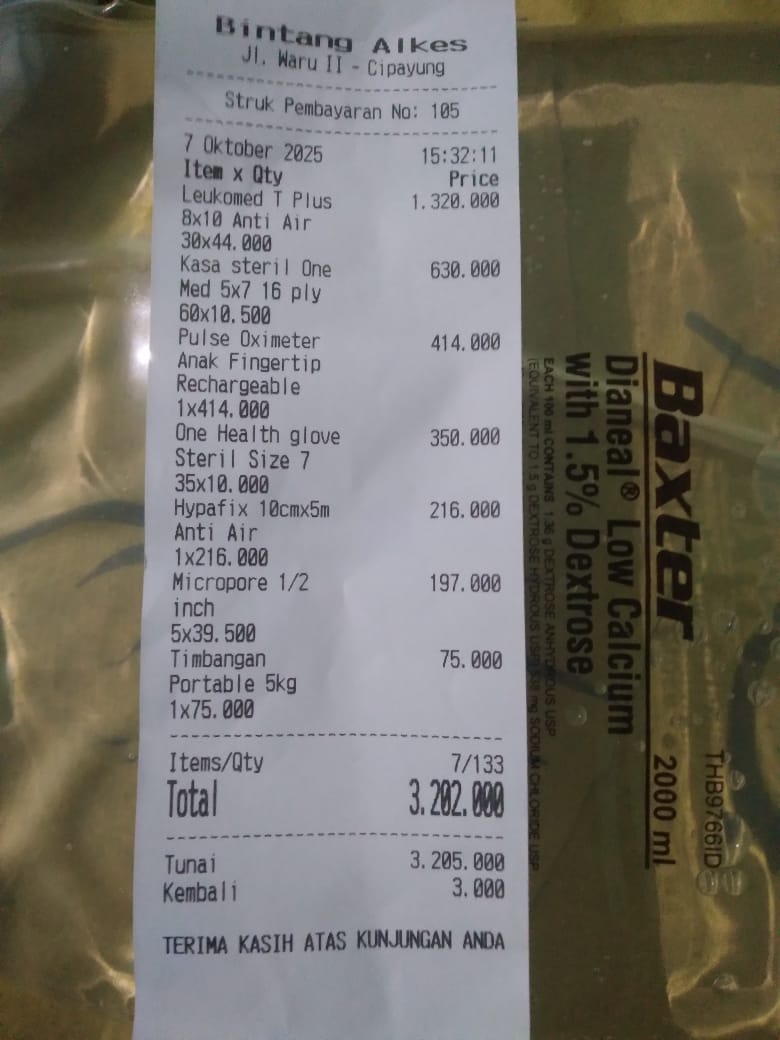 1. Pulse Oximeter anak Fingertip Rechargeable Rp 414.000 2. Calnic Plus Suspensi 100 ml Rp 251.000 3. Prove D3 Drop Rp 364.320 4. Mamy Poko RoyalRp Rp563.520 5. Pediasure CompleteVanila 800gr Rp 1.320.000 6. Wet Wipes Rp 17.900×3 = Rp 53.700 7. Minyak Telon Plus Rp105.600 8. Minyak Zaitun Rp310.000 9. Timbangan CAPD Rp 75.000 10. Kasa Steril Rp 615.000 11. Leukomed 1.330.200 12. Hypafix Rp196.800 13. Micropore Rp 193.920 14. Sarung Tangan Steril Rp 350.0002025-10-06 10:29:29
