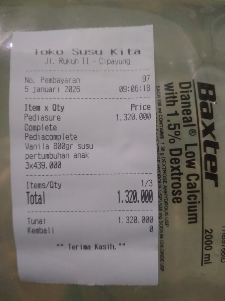 Dana digunakan untuk Susu pediacomplete vanila 800 gr Rp440.000x 3 = Rp 1.320.0002026-01-05 09:32:48