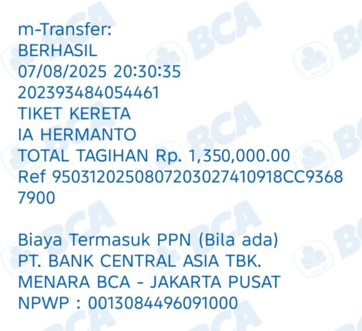 Dana digunakan untuk Tiket kereta api kontrol ke RSCM Rp450.000 x 3 orang = Rp1.350.0002025-08-05 09:47:59