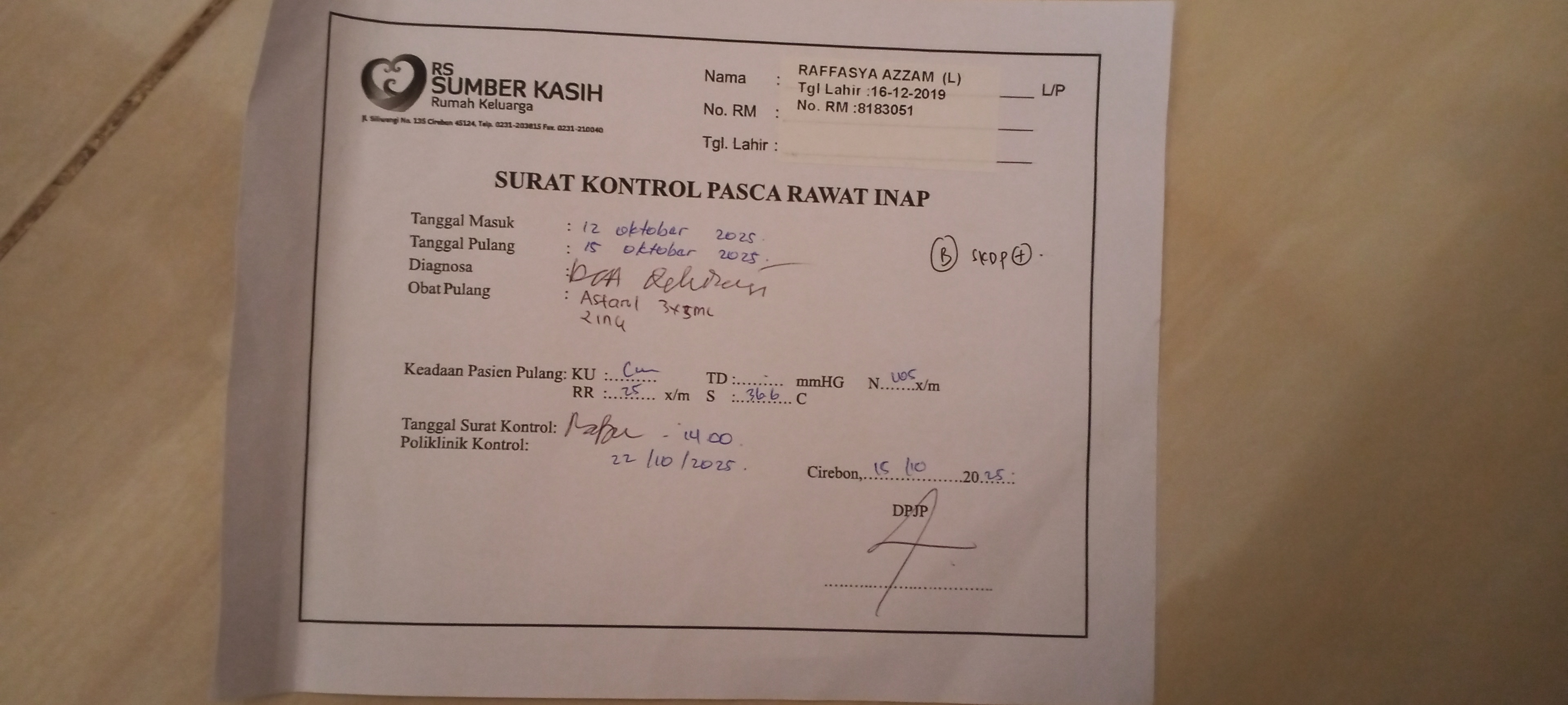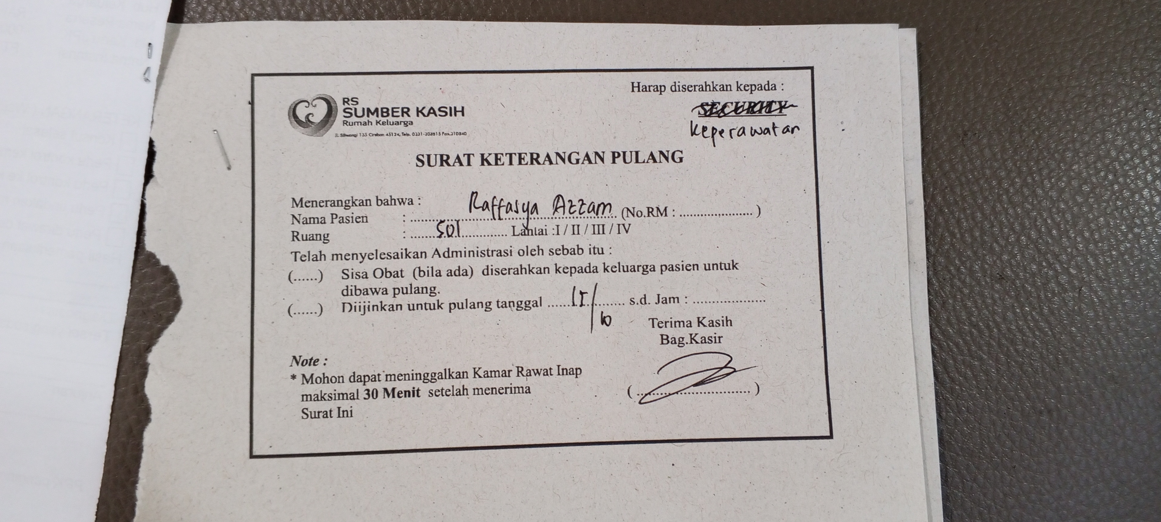 Alhamdulillah, setelah beberapa hari dirawat karena demam dan infeksi paru, Raffasya kini sudah diperbolehkan pulang dan sedang dalam masa pemulihan. Semoga kondisi Raffasya kedepannya semakin stabil dan sehat selalu.