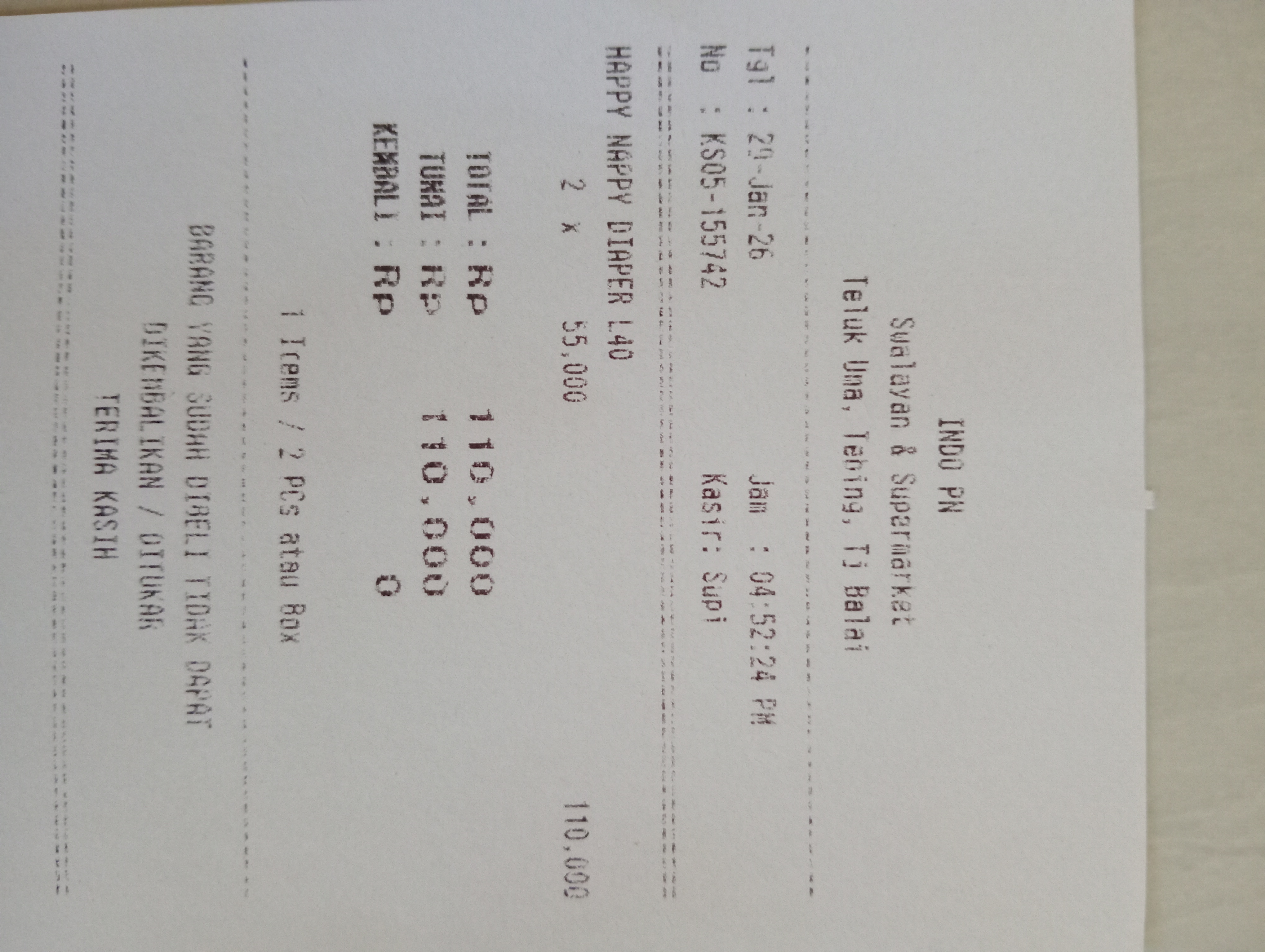 Dana digunakan untuk 1. Pampers happy napy size L 40 2 x Rp.55.000= Rp. 110.000 2. Susu SGM 3+ vanila 900gr 4 x Rp.78.000=Rp. 312.0002026-02-02 13:24:43
