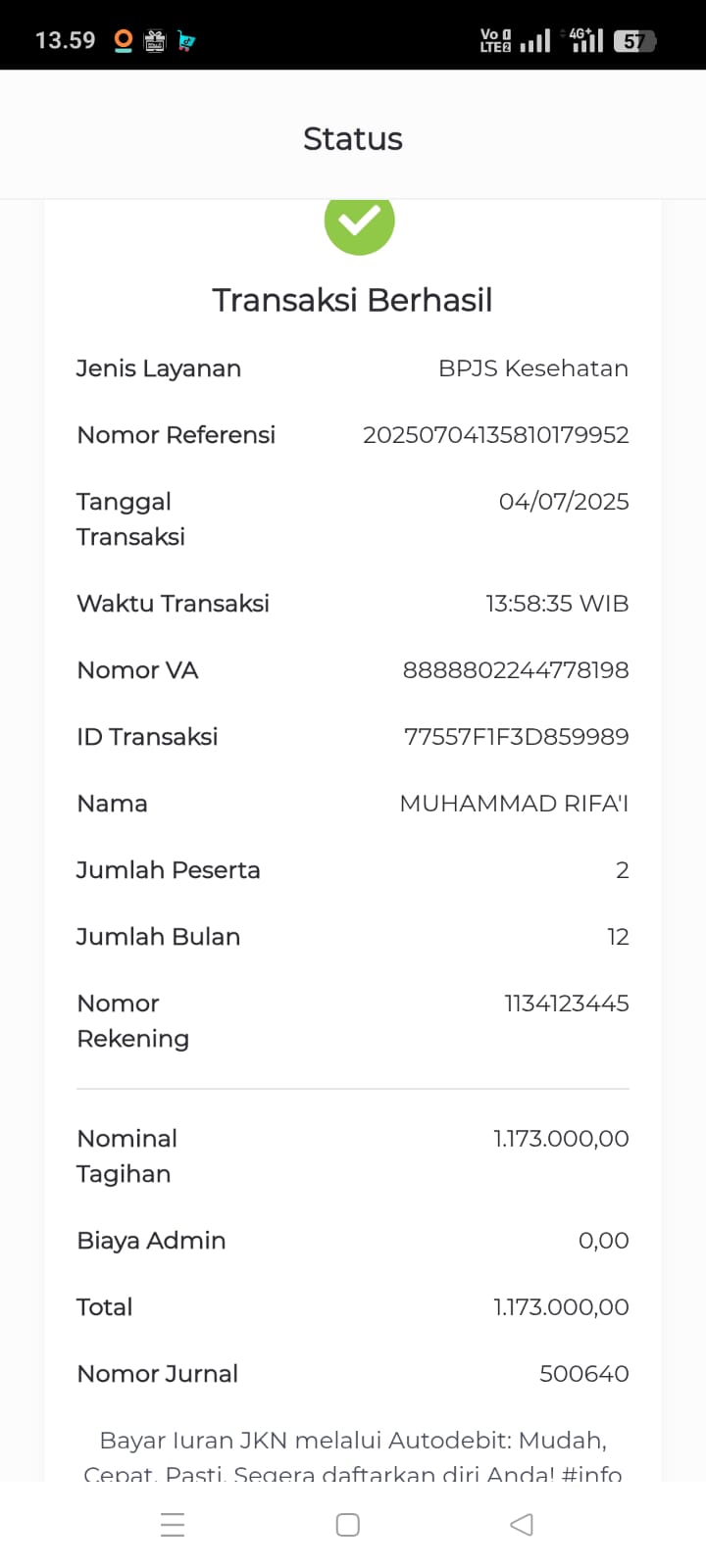 Dana digunakan untuk 1. Pampers Rp95.000 2. Tissu basah Rp21.500 3. Pembayaran tunggakan BPJS Rp1.173.000 4. Biaya makan selama rawat inap Rp800.0002025-06-24 10:17:24