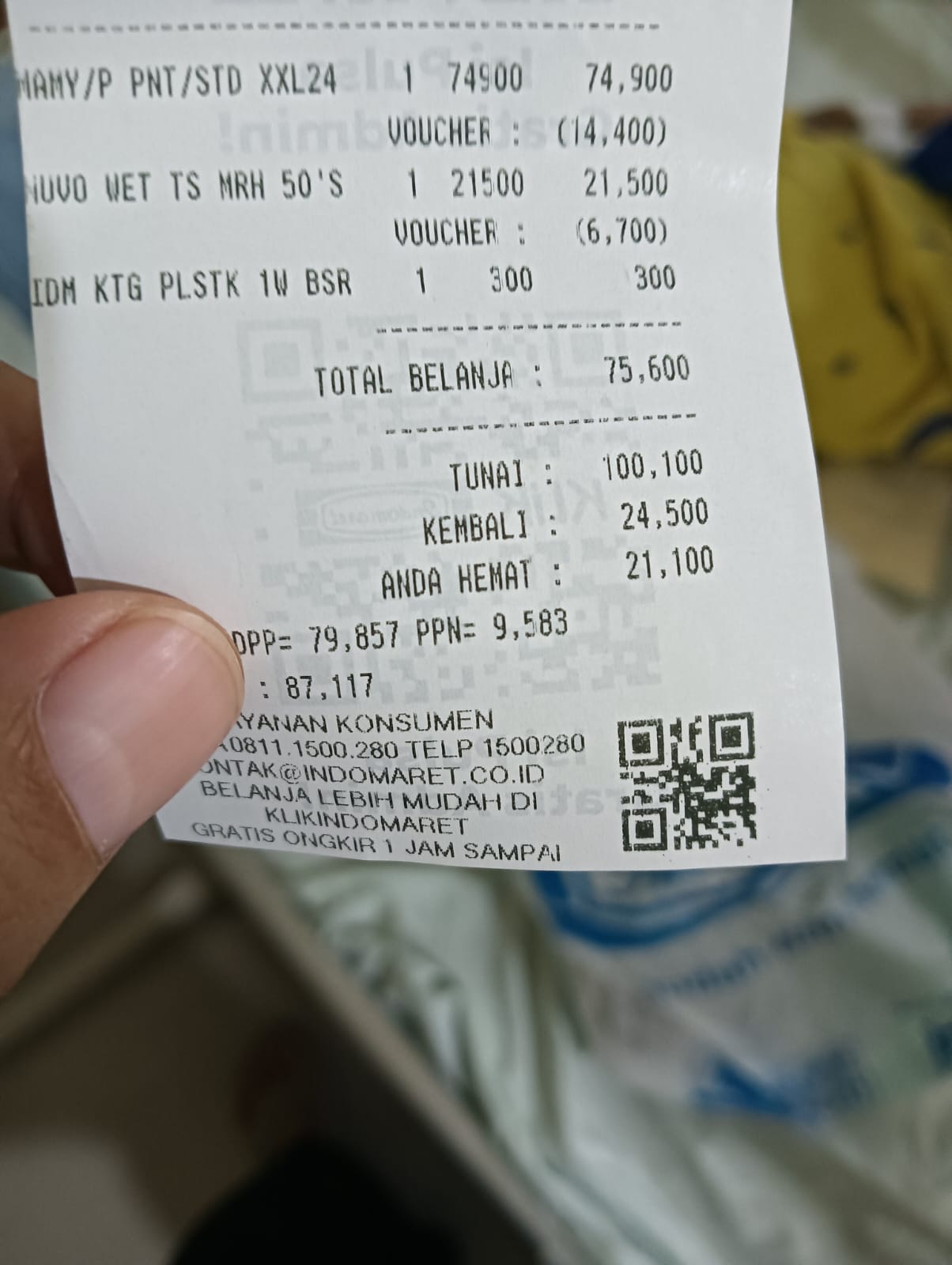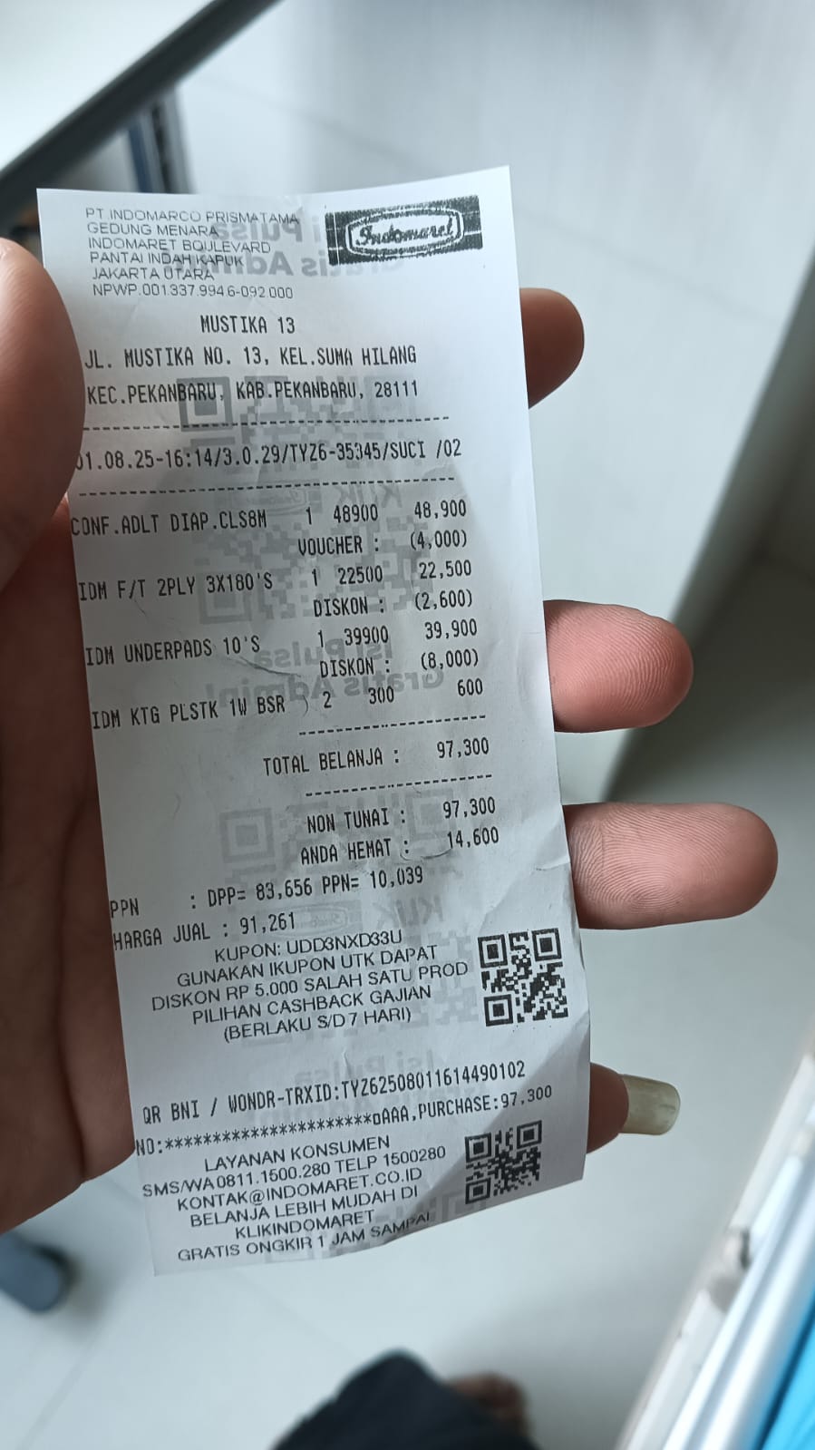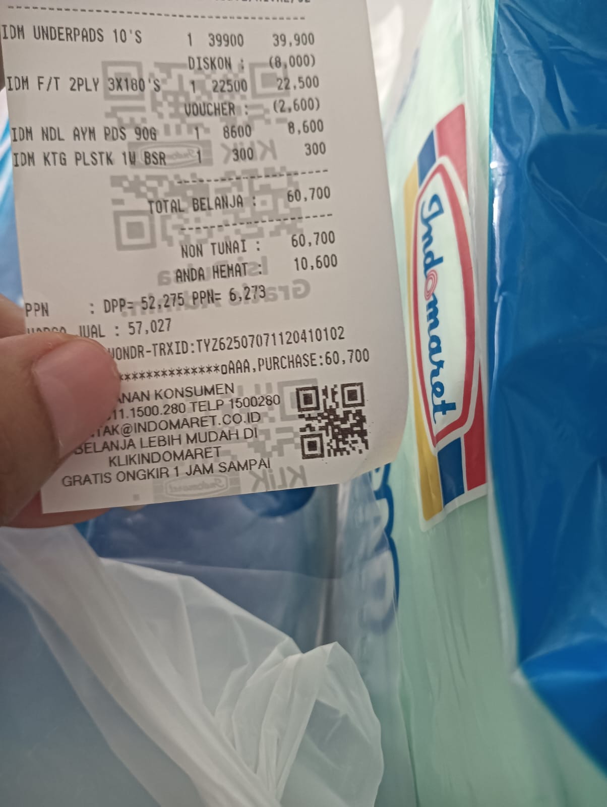 Pampers dewasa: 6 bal × Rp65.000 = Rp390.000