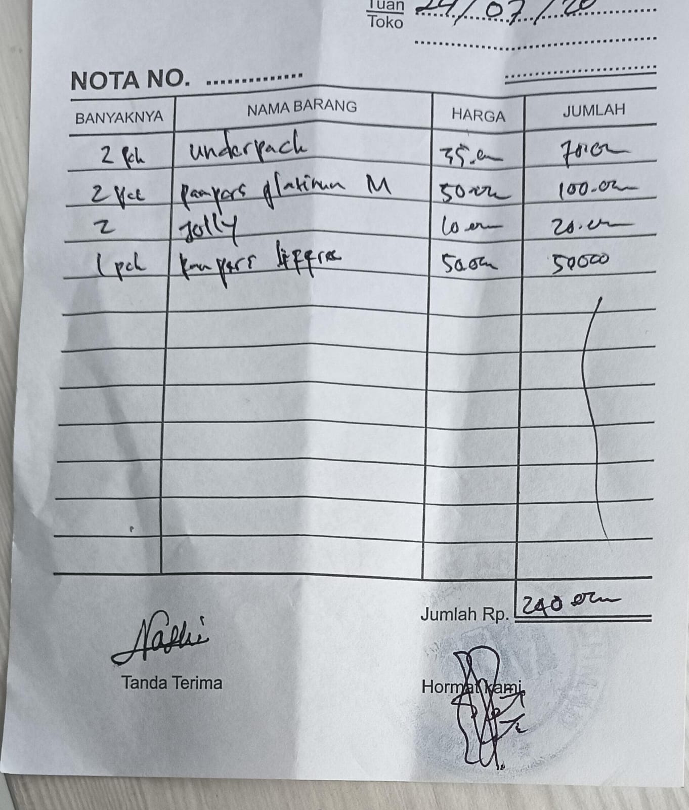 Underpad: 6 bal × Rp50.000 = Rp300.000