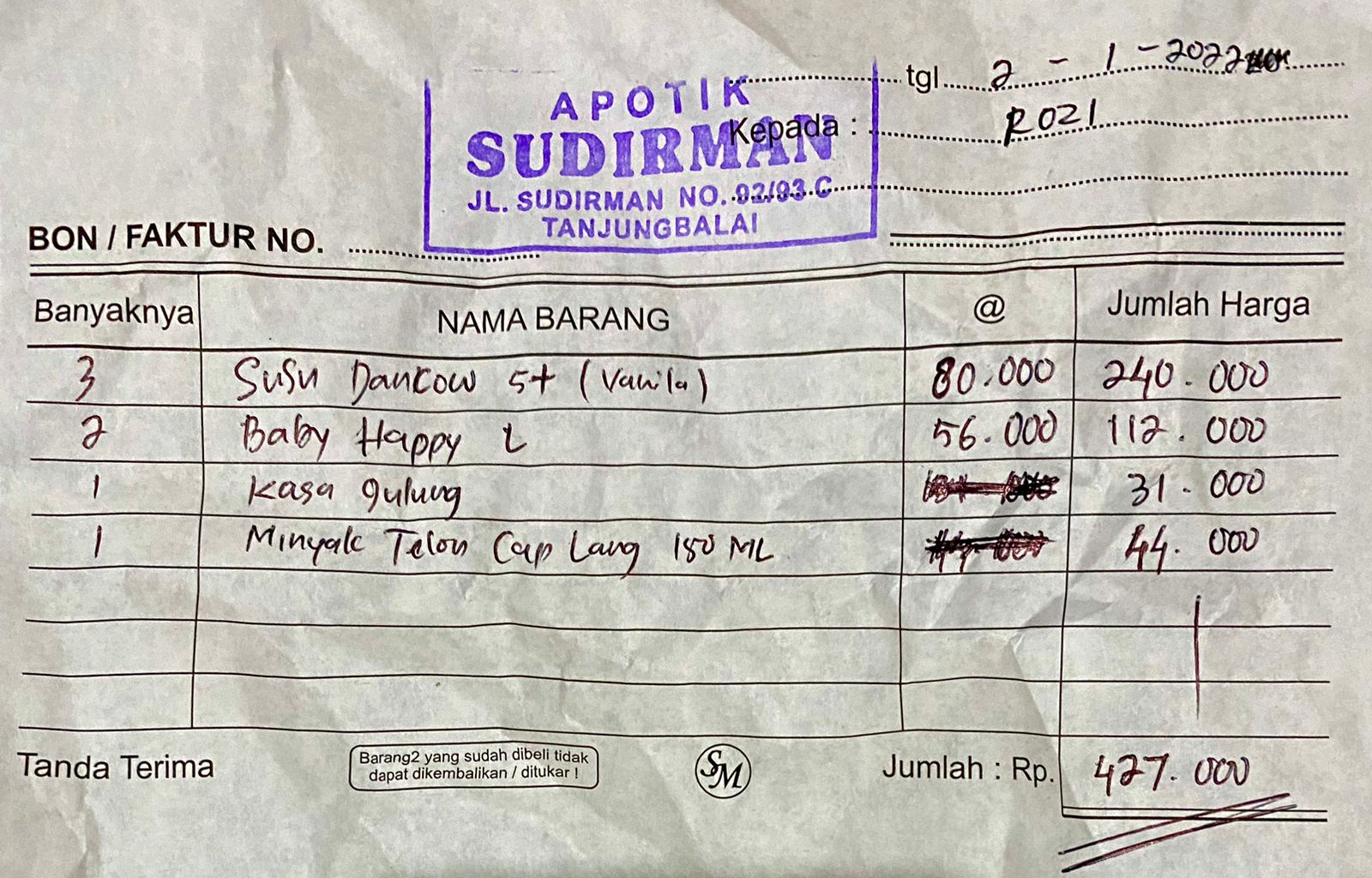 Susu Dancow Fortigro 900g Rp. 94.000 x 3 = Rp. 282.000 Pempers Sweety ukuran M Rp. 52.000 Paseo Basah Rp. 34.000 Paseo Kering Rp. 11.000 x 2 = Rp. 22.0002022-06-01 08:12:06