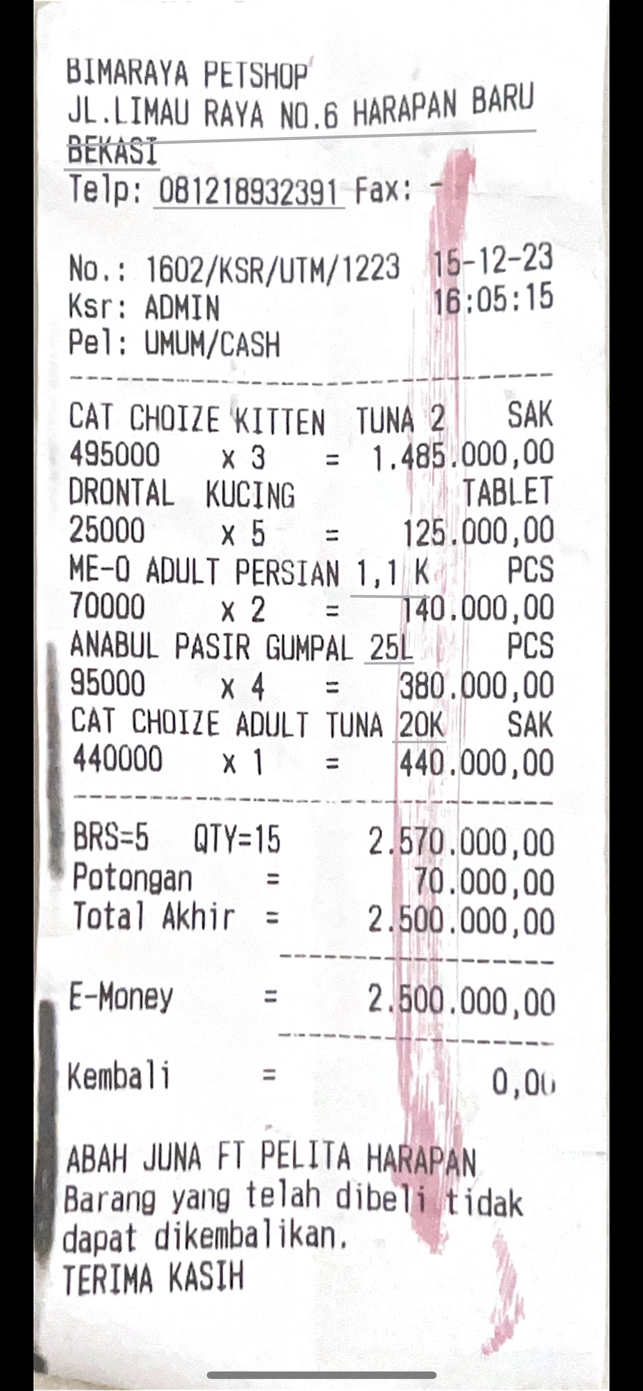 Dana digunakan untuk 1. Pakan Dry food merk cat Choize 20 kg Adult 480.000 x 3 karung= Rp1.440.000 2. Pakan Dry food merk cat Choize 20 kg Kitten 450.000 x 2 karung= Rp900.000 3. Pakan Dry food merk cat Choize Kitten 30.000 x 7 kg= Rp210.000 4. Pel 40.000 x 3= Rp120.000 5. Refill pel 25.000 x 5= Rp125.000 6. Wipol 750 ml 30.000 x 10= Rp300.000.2023-12-13 19:17:48