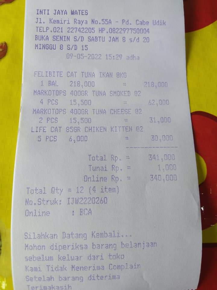Dana digunakan untuk: 1. Catfood Bolt 1 sak 20KG Rp400.000 2. Obat yusimox dan minyak ikan 2 pcs @26.000 Rp52.000 3. Salep scabies 2 pcs @25.000 Rp50.000.2022-09-27 17:18:26