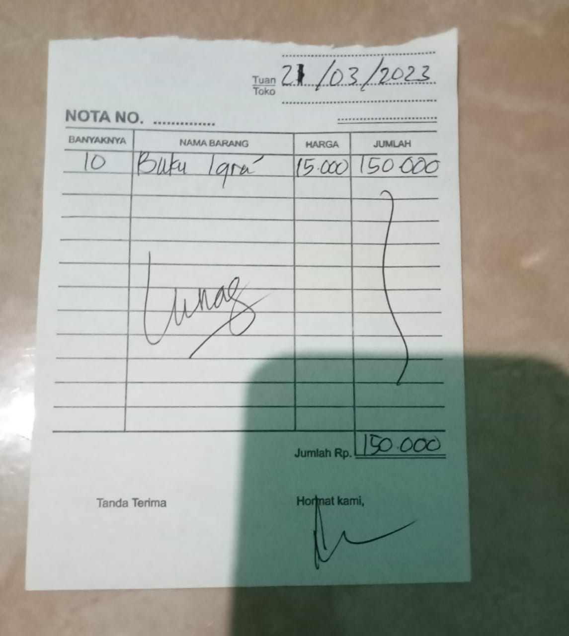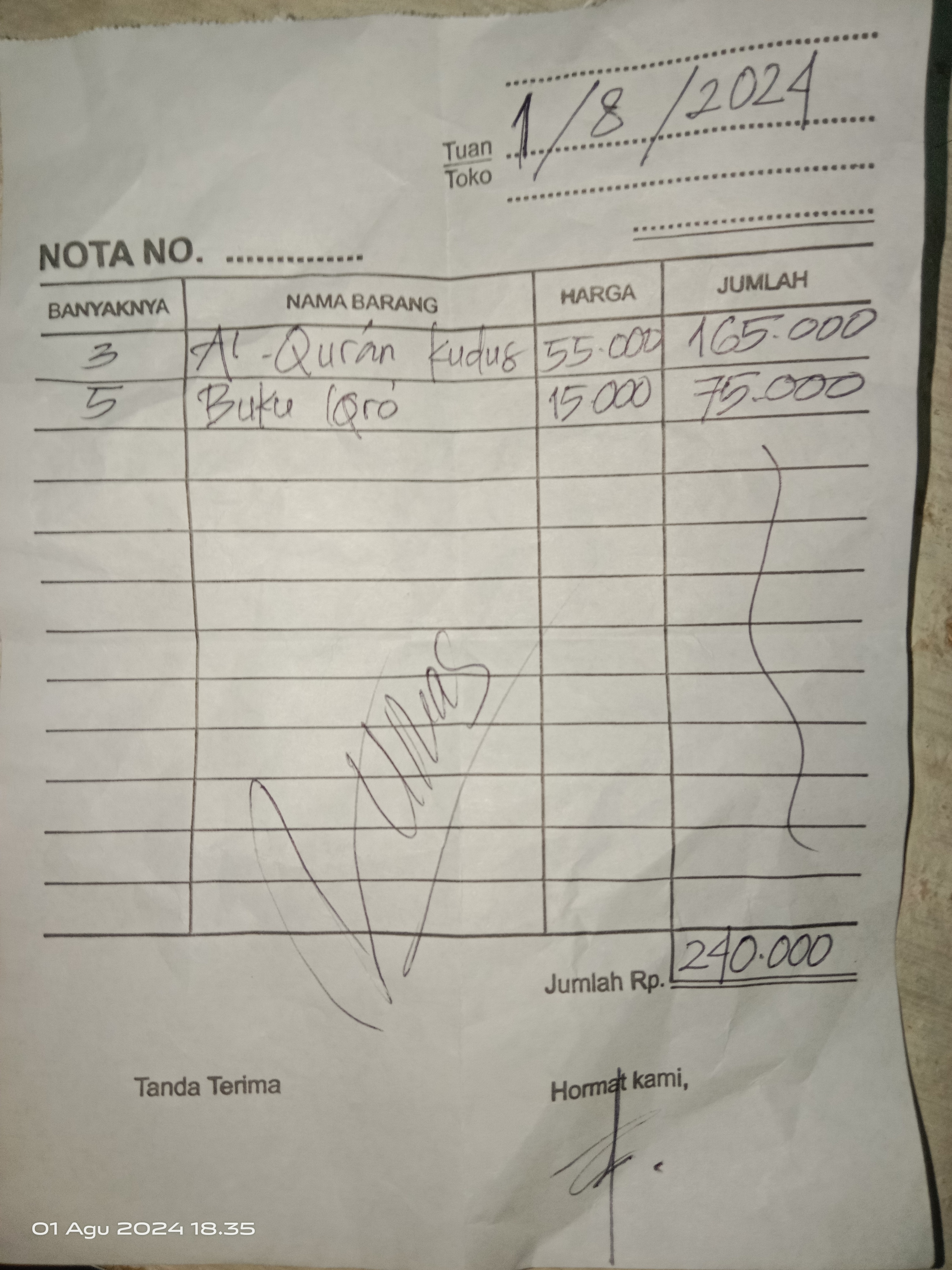 Dana digunakan untuk pembelian Al Qur'an 3 x 55.000 = Rp. 165.000 , dan buku Iqro' 5 x 15.000 = Rp. 75.0002024-07-30 10:01:21