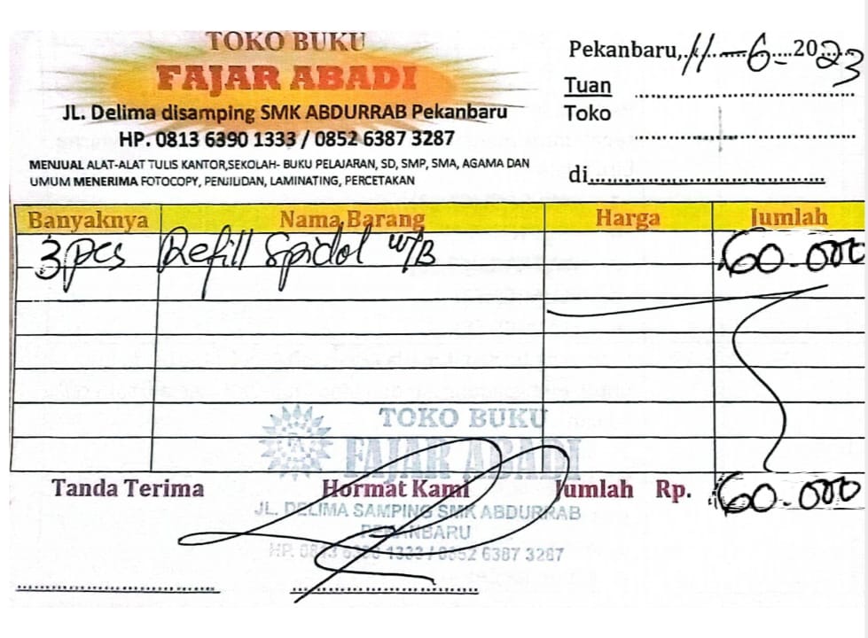 Dana digunakan untuk pembelian tinta spidol sebanyak 3 kotak.2023-05-22 18:59:48