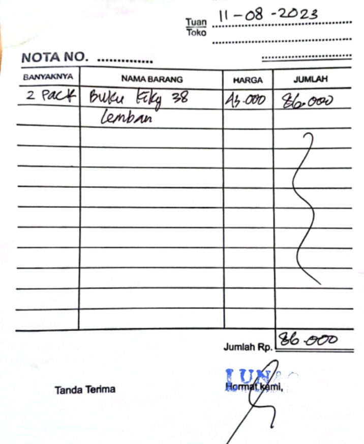 Dana digunakan untuk membeli buku tulis sebanyak 2 pack.2023-07-24 15:57:55