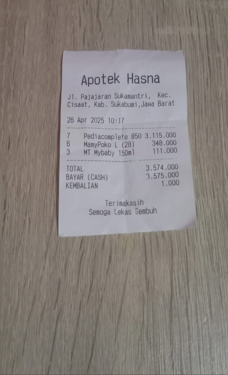 Dana digunakan untuk 1. Susu pediacomplete 850gram Rp445.000 x 7 pcs = Rp3.115.000 2. Pampers mamypoko ukuran L Rp58.000 x 6 ball = Rp348..000 3. Minyak telon mybaby ukuran 150 ml Rp37.000 x 3 = Rp111.000.2025-04-25 09:44:12