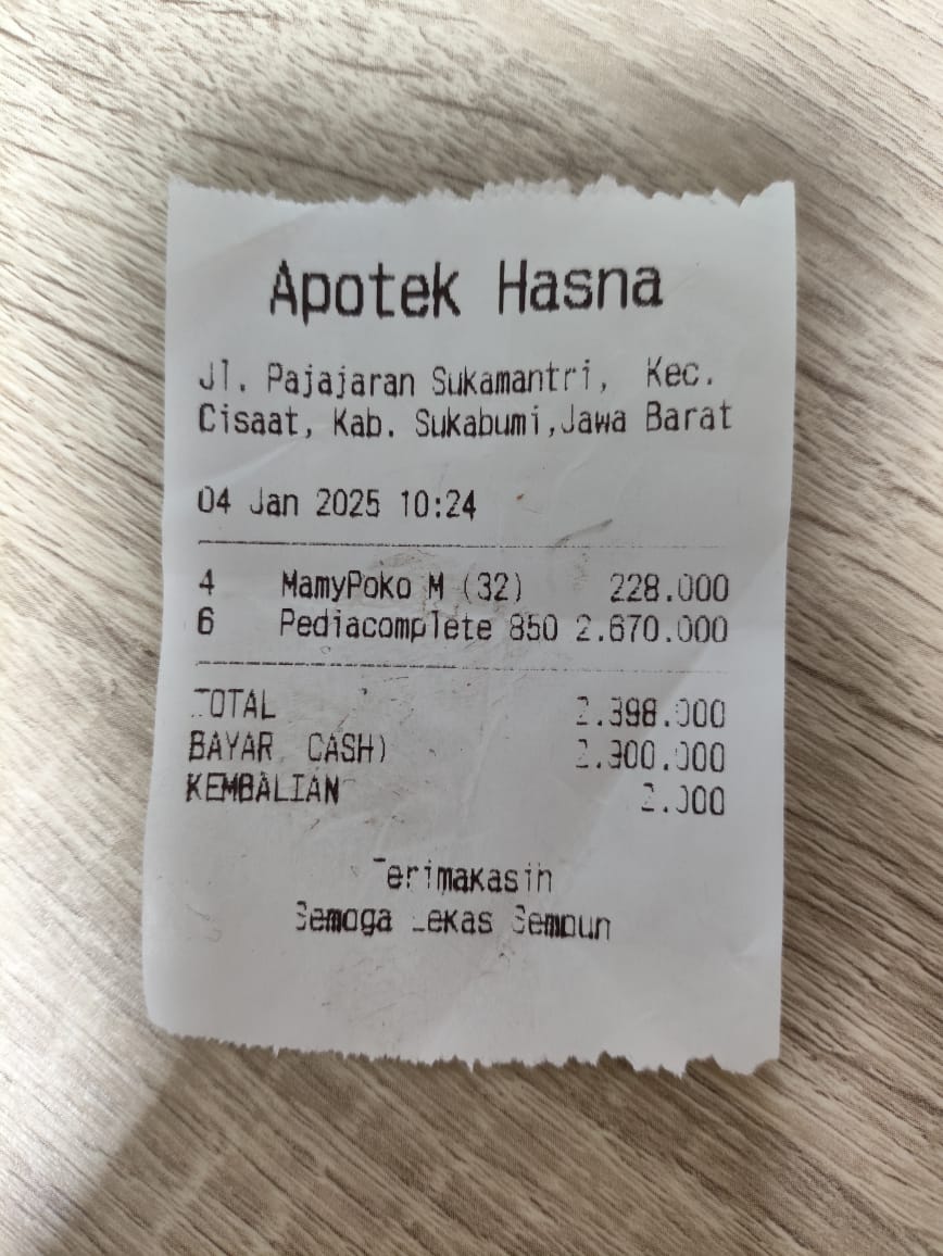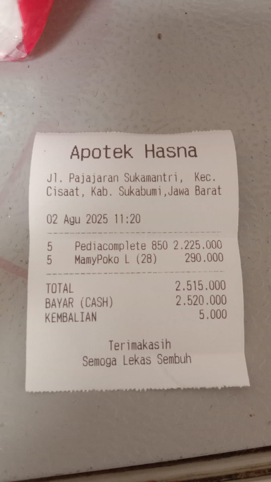 1. Susu medis pediacomplete ukuran 850 gr harga Rp. 375.000 x 2 kaleng = Rp750.000