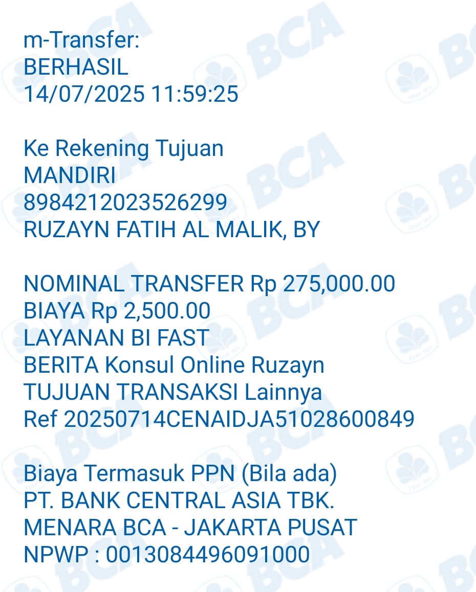 Dana digunakan untuk 1. Reimbuse Transportasi PP Kontrol Rs.Jantung Harapan Kita Rp.1.760.000 2. Reimbuse Konsultasi online Rp275.000 3. Reimburse tindakan dokter Rp250.000 4. Reimbuse penginapan Rp400.0002025-08-28 09:29:56