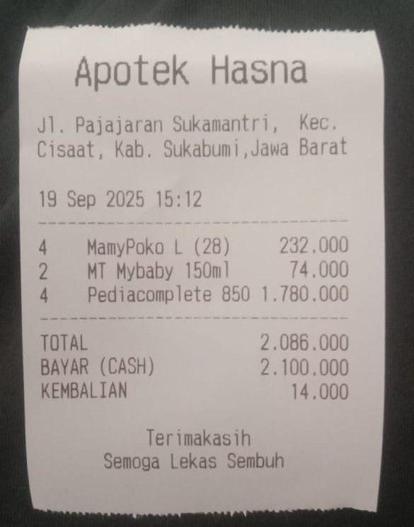 Bantuan yang diberikan oleh #TemanBaik untuk anak kami telah kami gunakan untuk membeli kebutuhan sehari-hari, di antaranya susu medis pedia complete ukuran 850 gr sebanyak 6 kaleng dan popok MamyPoko ukuran M sebanyak 5 buah.