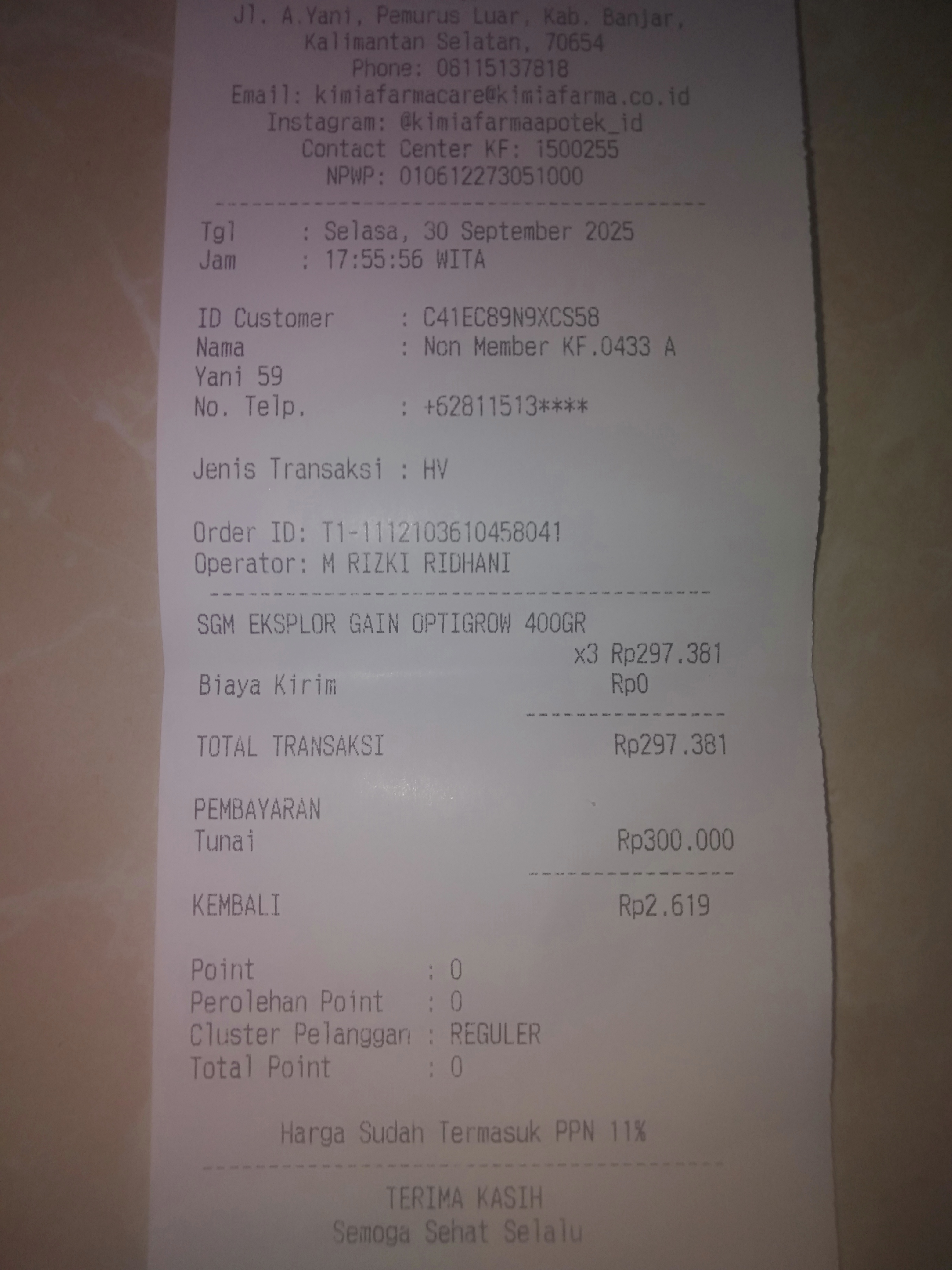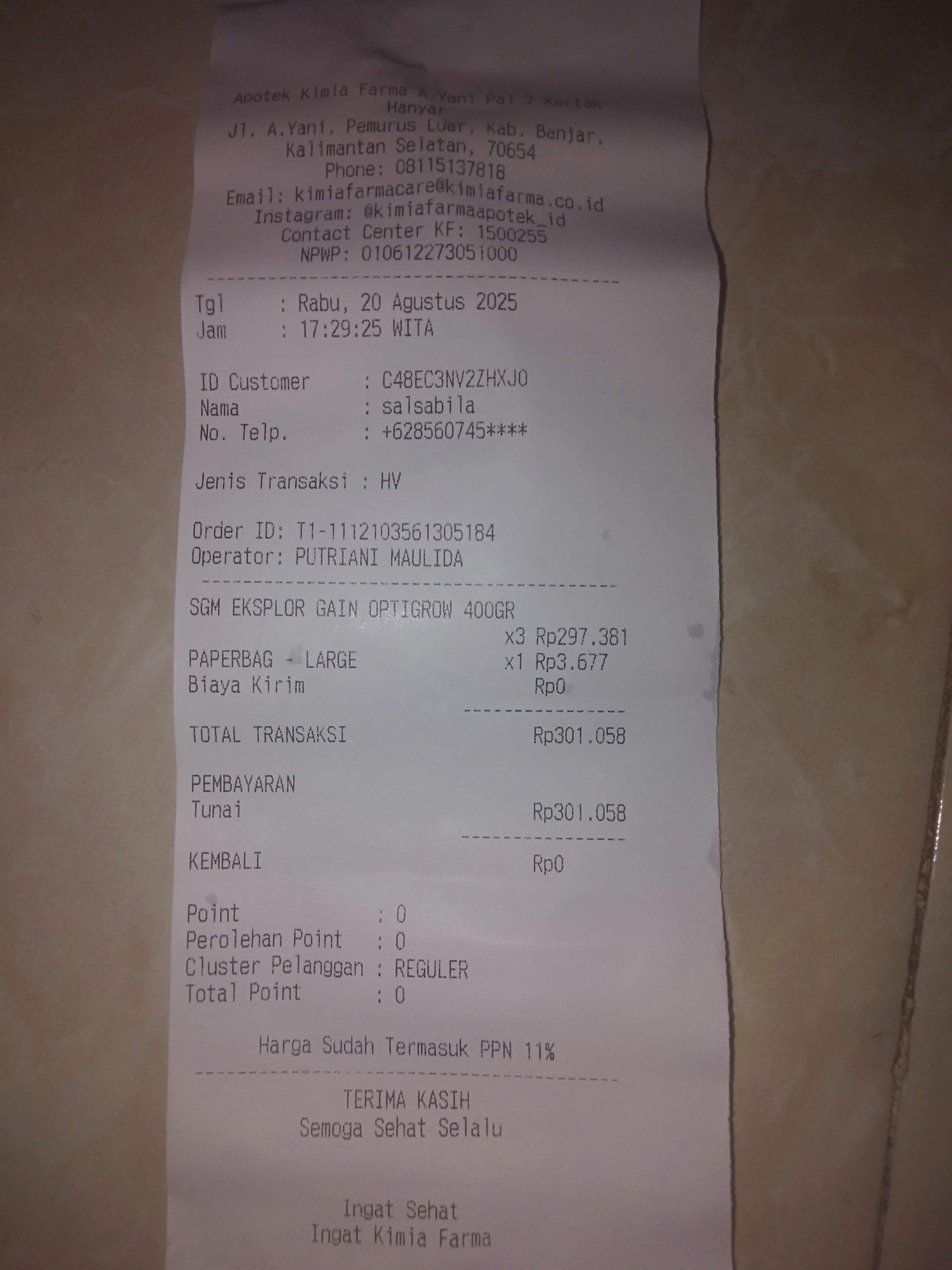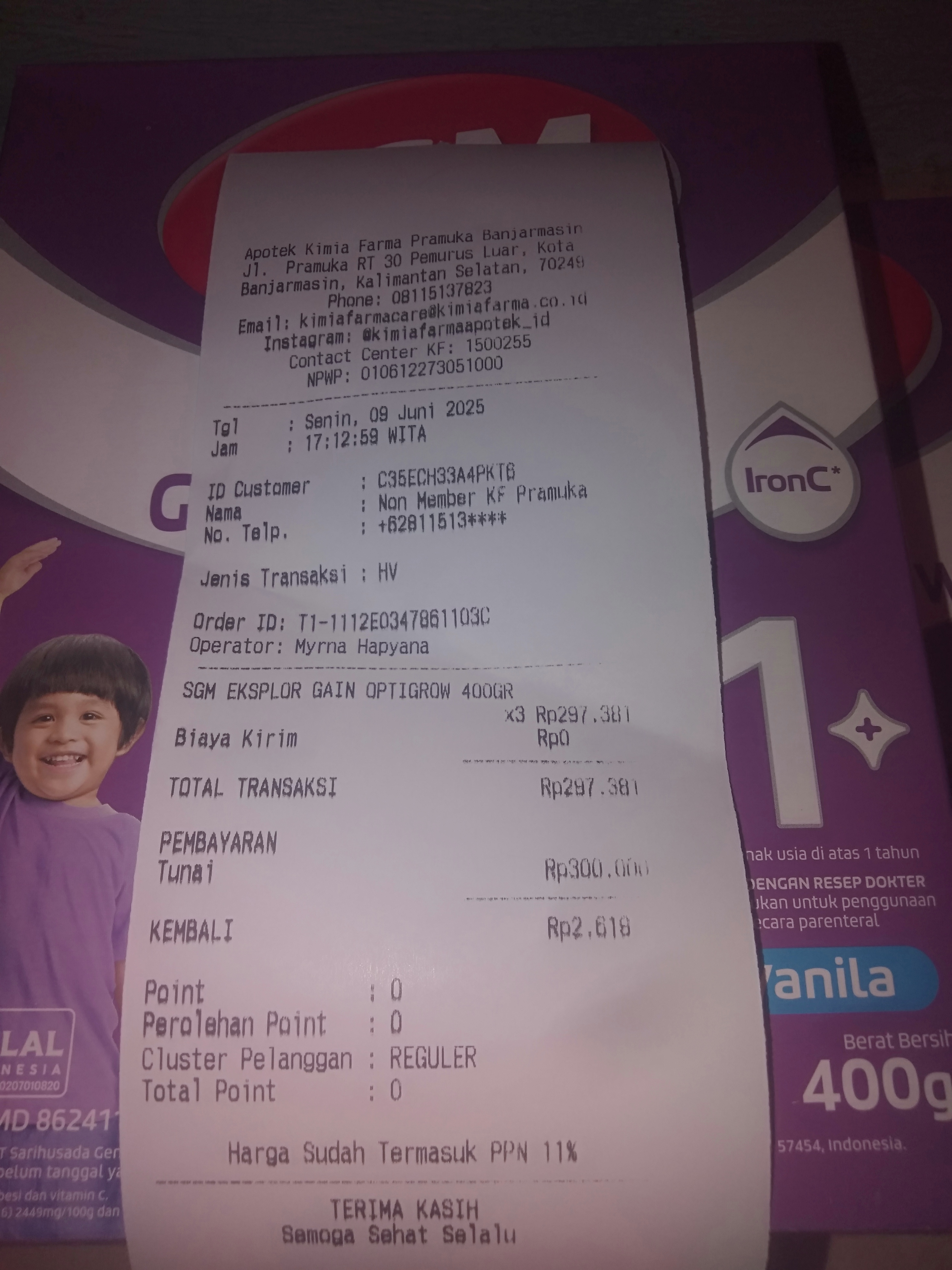Dana digunakan untuk 1.Susu SGM optigrow 1+, Rp100.000 x 3 kotak = Rp 300.000 2. Biaya konsumsi kontrol Rp150,0002025-09-30 09:43:56