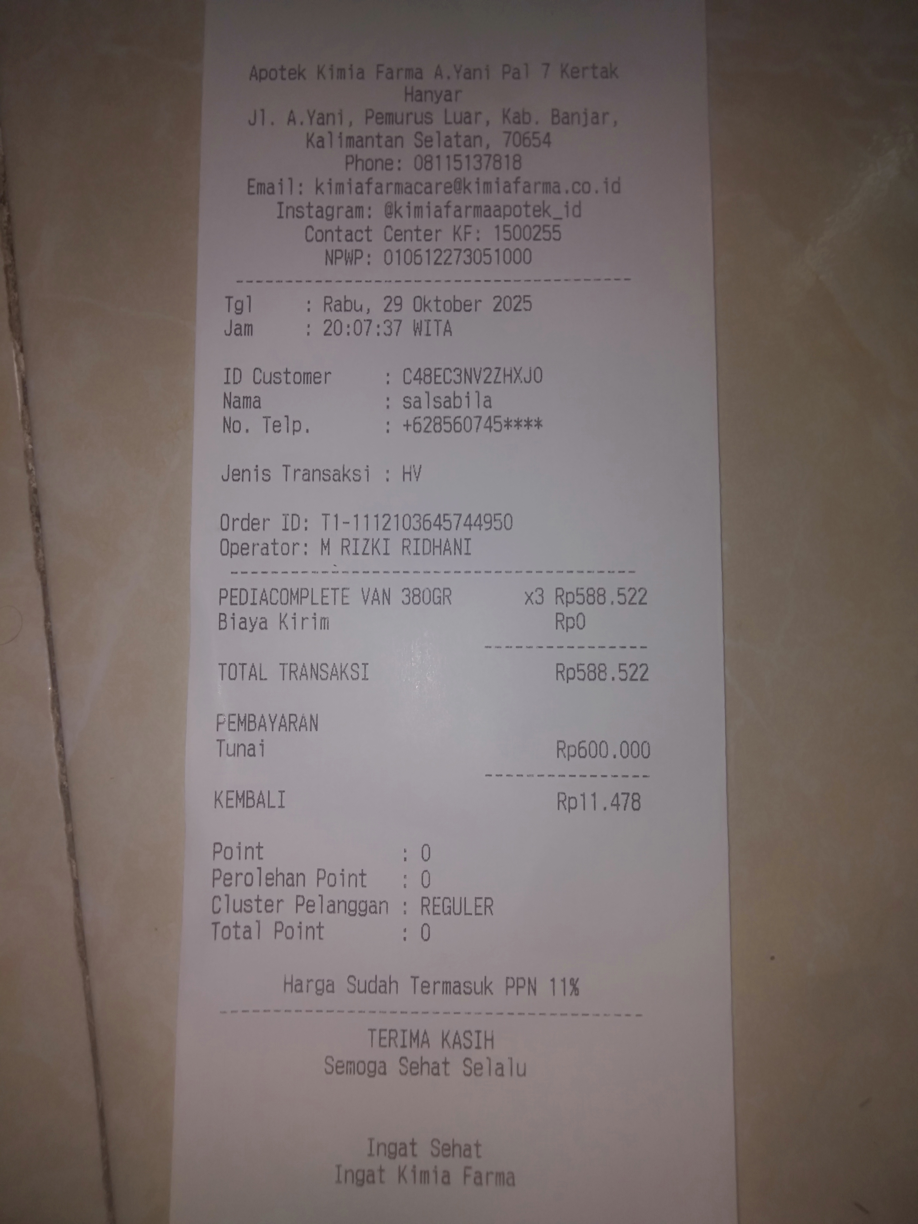 Dana digunakan untuk 1. Susu pedia complete isi 400 gr 3 × Rp200.000= Rp600.000 2. Konsumsi Kontrol ke RS Rp 150.0002025-10-29 10:38:23
