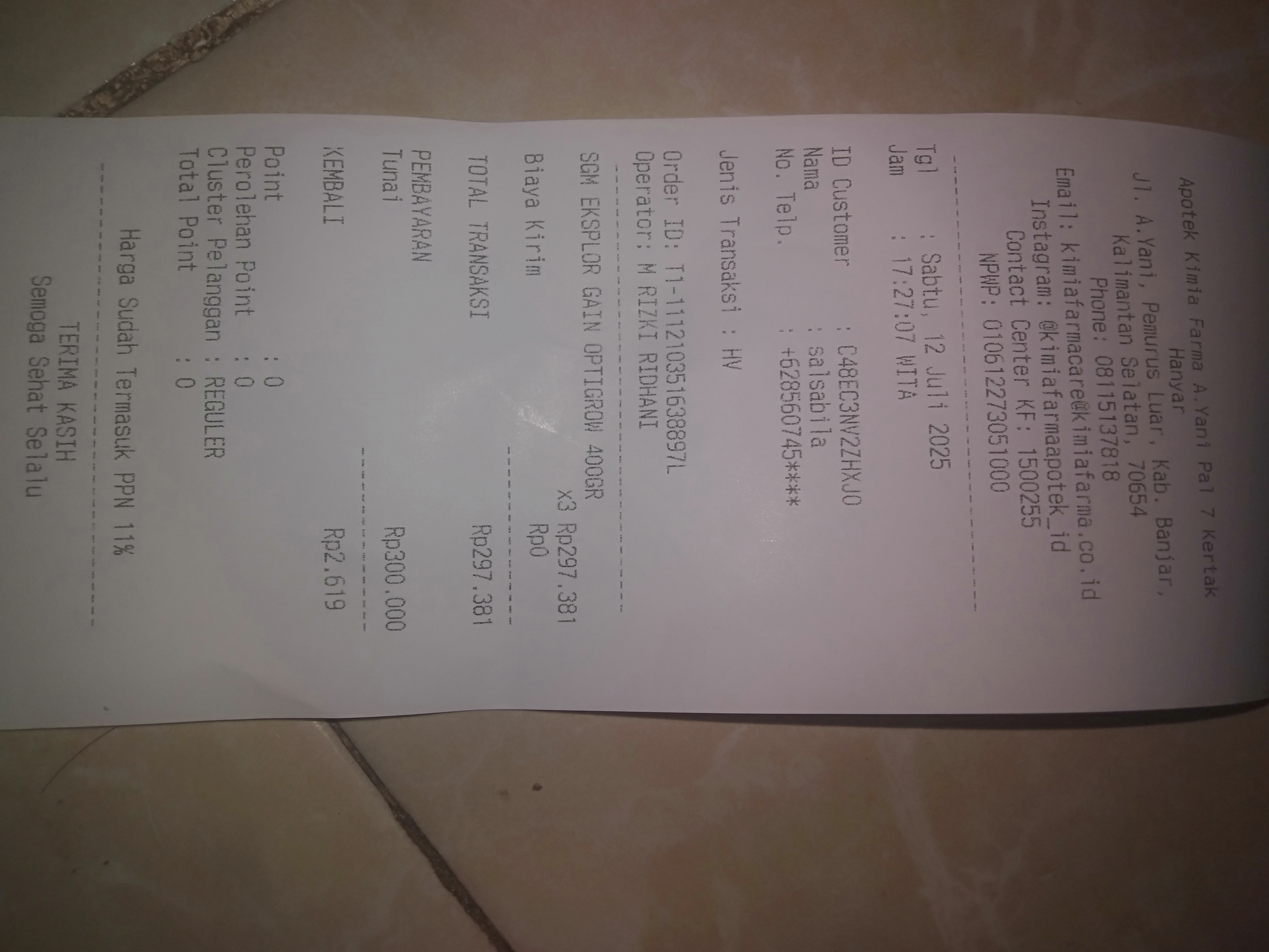 Dana digunakan untuk 1. Susu SGM optigrow 1+ Rp100.000 x 3 dus= Rp300.000 2. Konsumsi untuk kontrol 2 kali sebulan Rp150.0002025-07-14 13:40:02