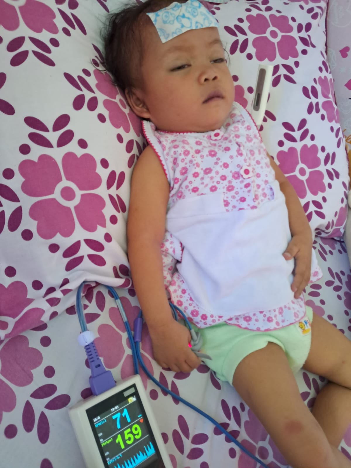Napas Salvina masih ngos-ngosan. Saturasi pun masih kurang baik di bawah 75%. Mohon doakan Salvina ya TemanBaik.