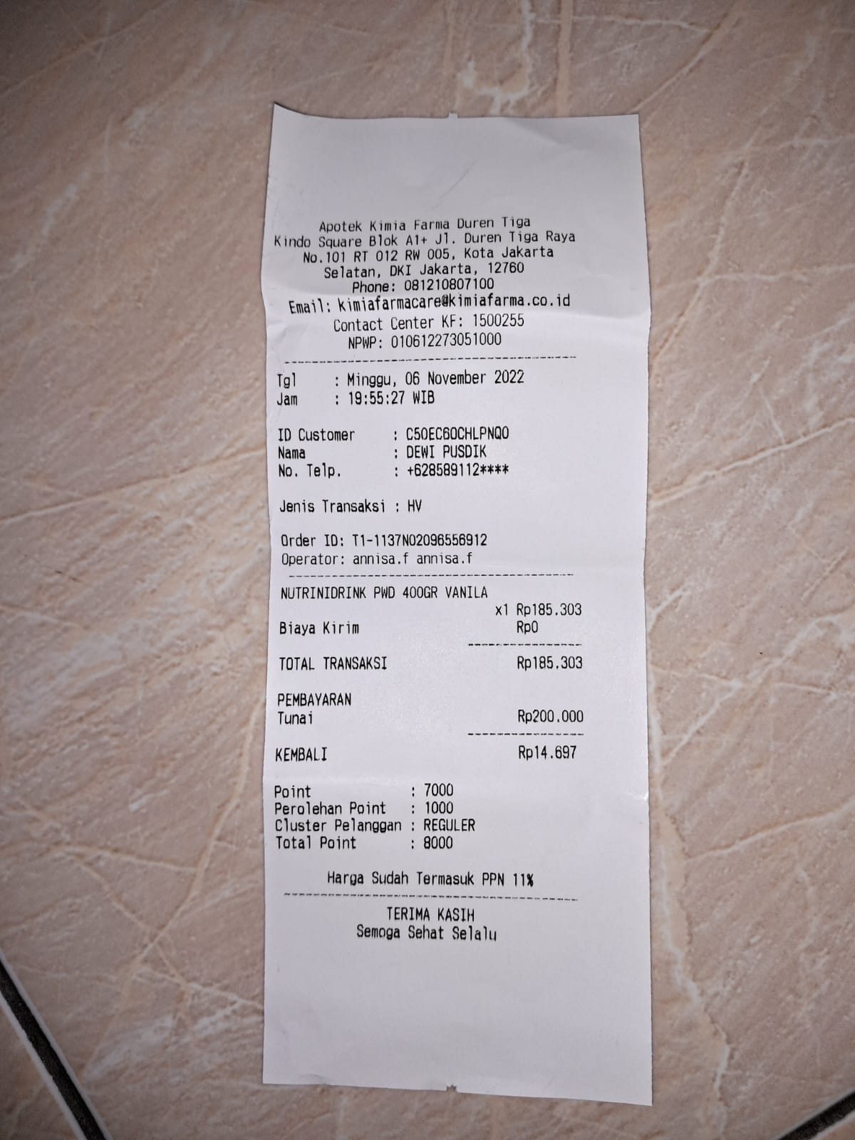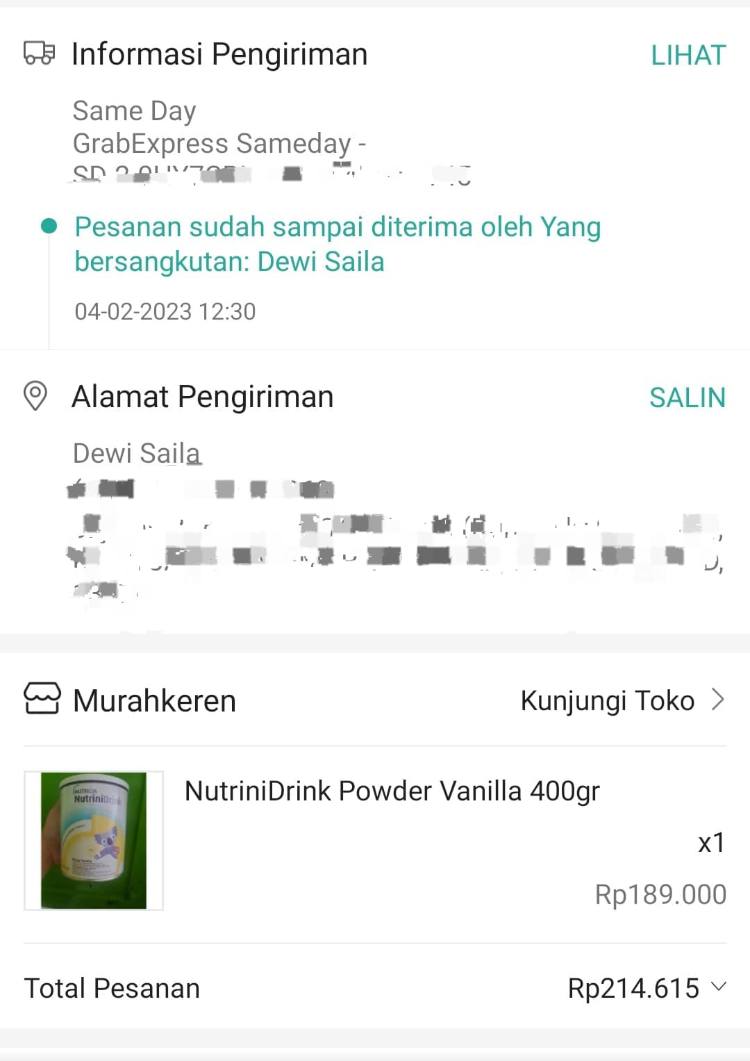 Dana digunakan untuk pembelian Susu Nutrinidrink Powder 195.000 x 5 kaleng= Rp975.000.2023-01-03 17:15:05