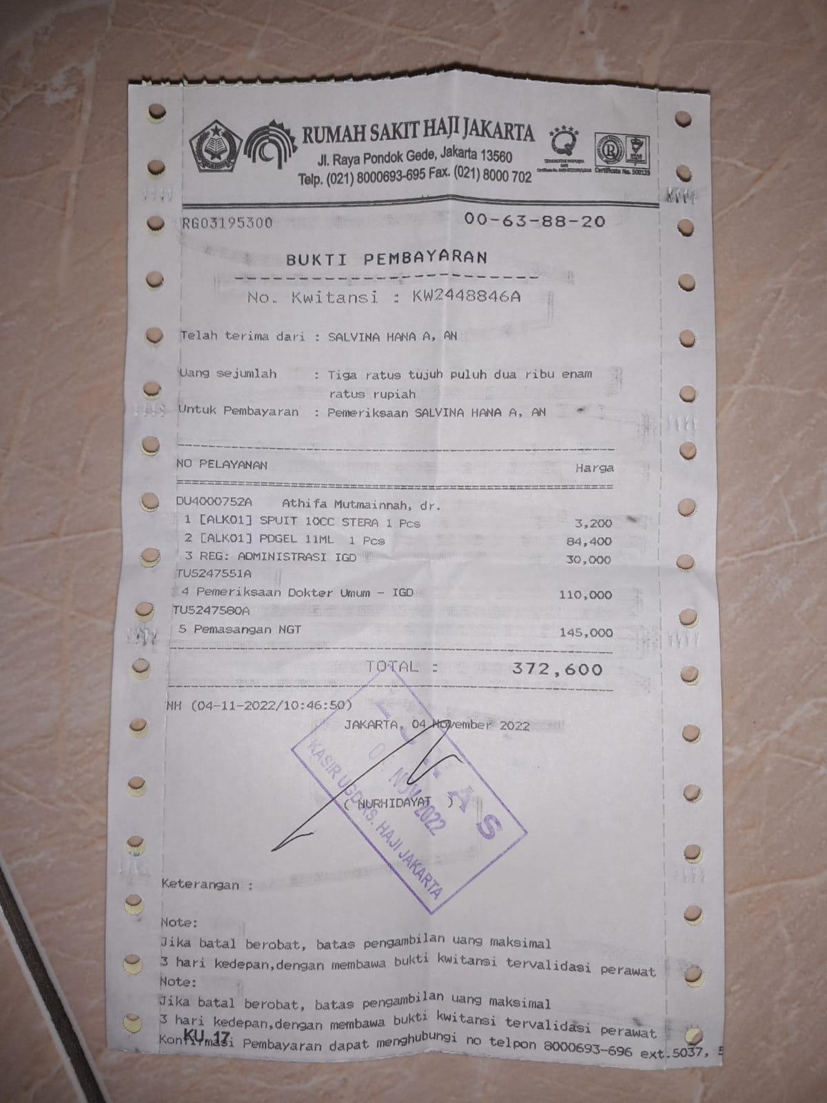 Kami mau mengabarkan kondisi Salvina. Kemarin tidak jadi pasang NGT karena Salvina diare. Sehingga dokter menyarankan untuk membeli obat.