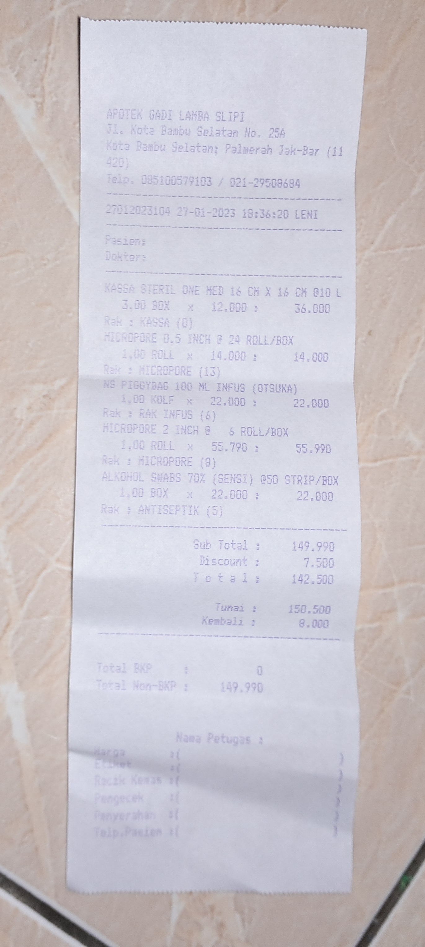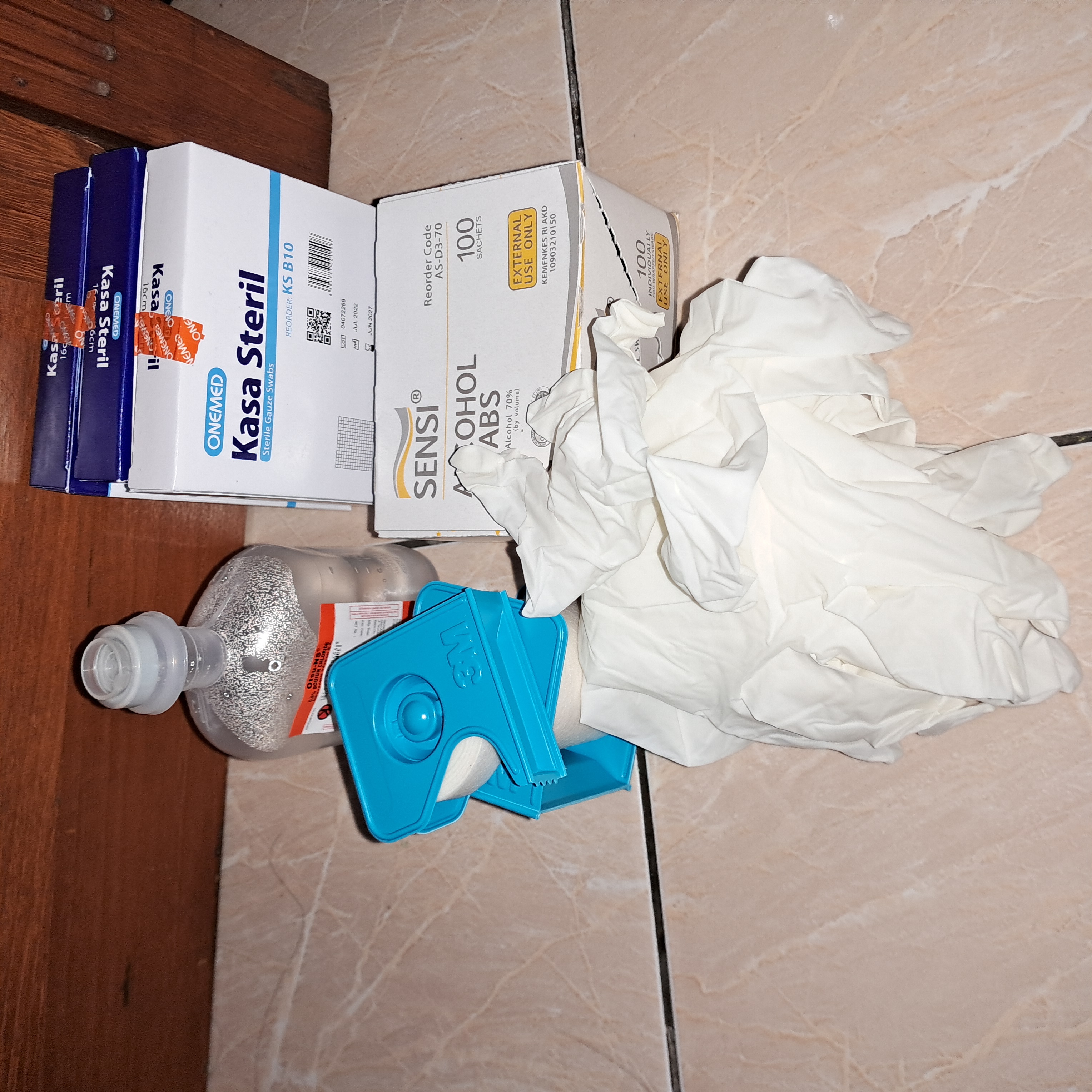 Dana digunakan untuk 1. Kasa steril 4 pak Rp25.000 2. Cairan NaCl Rp25.000 3. Plester Micropore Rp24.000 4. Betadine antiseptic Rp28.000 5. Alcohol swab 1 kotak Rp20.000 6. Susu Nutrinidrink 1 kaleng Rp195.000.2023-01-26 17:12:33