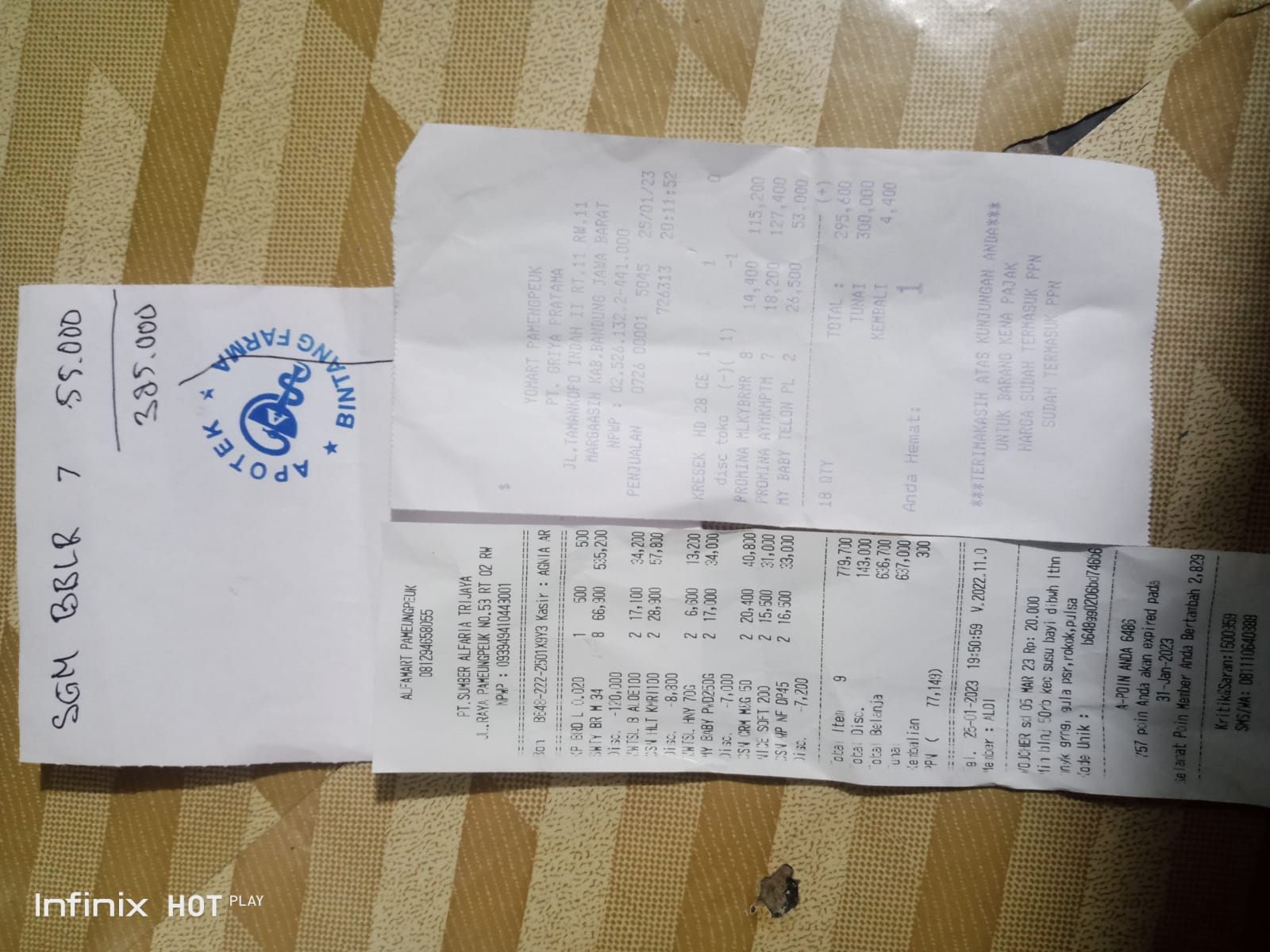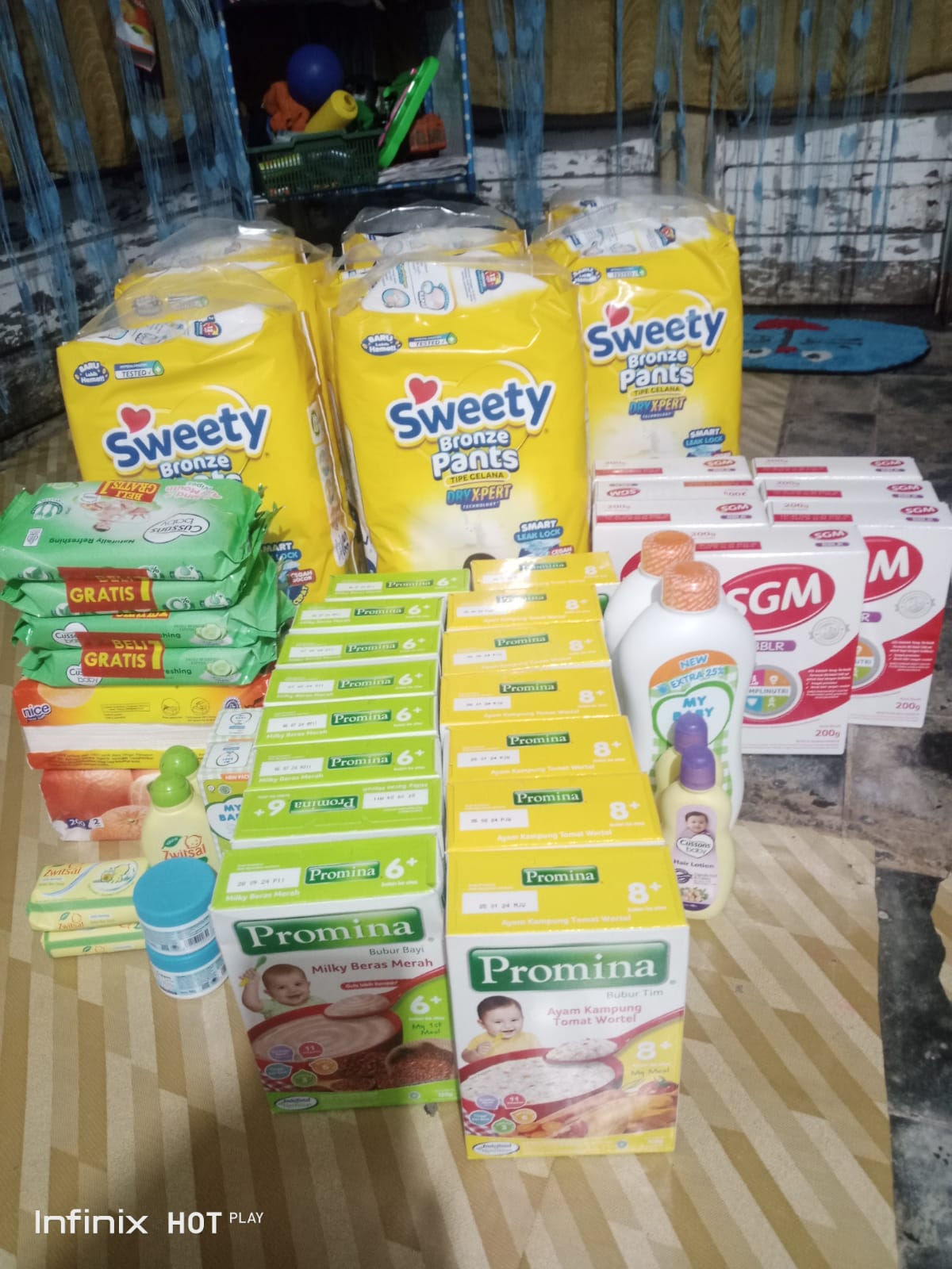 Dana digunakan untuk 1. Susu SGM BBLR Uk 400 gr 95.000 x 7 box= Rp665.000 2. Pampers Sweety M34 65.000 x 8= Rp520.000 3. Promina 17.500 x 15 box= Rp262.500 4. Minyak telon 26.000 x 2= Rp52.000 5. Bedak 14.000 x 2= Rp28.000 6. Tisu basah 17.000 x 5= Rp85.000 7. Tisu kering 15.000 x 2= Rp30.000 8. Sabun mandi anak 7.000 x 2= Rp14.000 9. Minyak rambut 22.000 x 2= Rp44.000 10. Baby cream 19.000 x 2= Rp38.000 11. Sampo anak 17.000 x 2= Rp34.000.2023-01-25 17:50:47