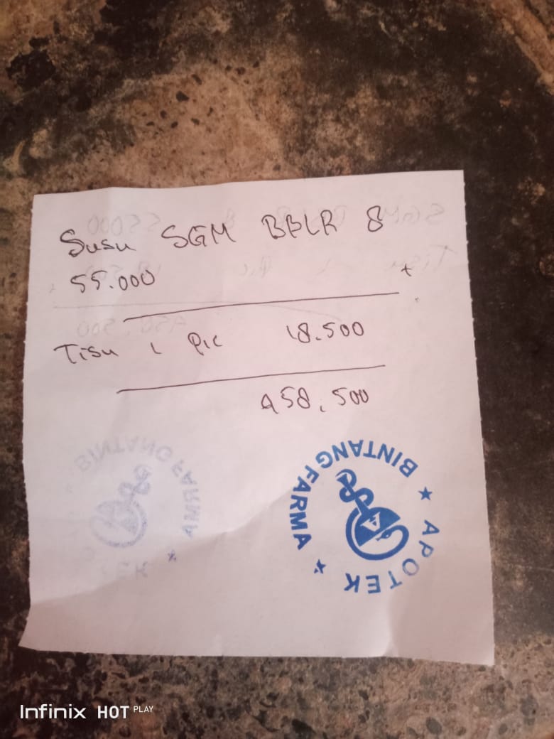 Dana digunakan untuk 1. Vitabumin 130 ml 64.000 x 4= Rp256.000 2. Susu SGM BBLR 200 gr 55.000 x 5= Rp275.000.2023-02-09 17:09:00