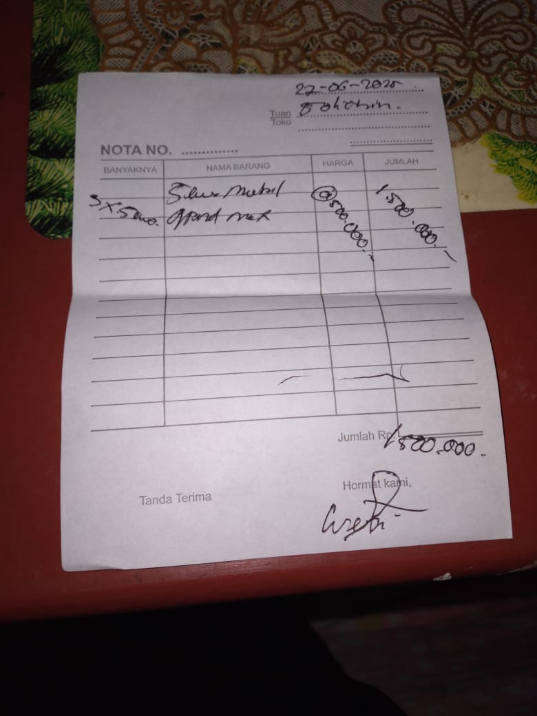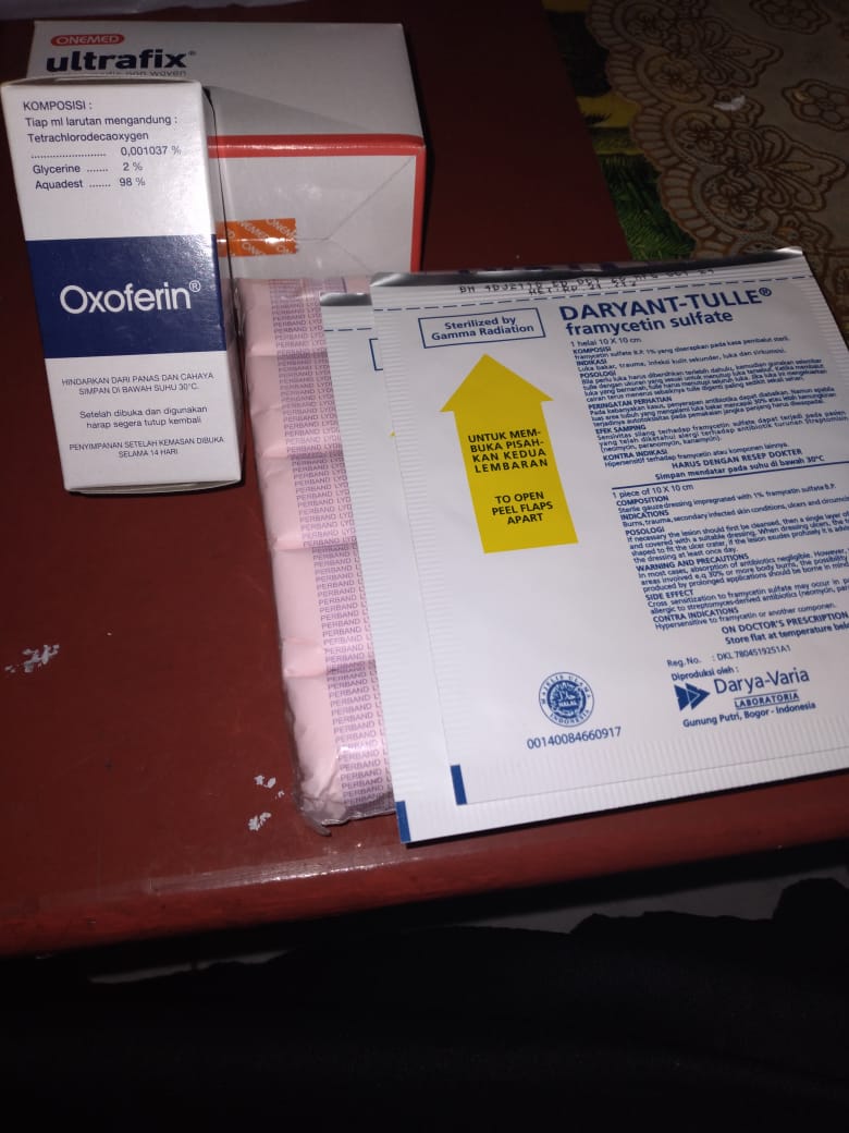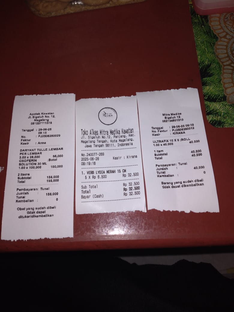 Dana digunakan untuk 1. Sewa mobil ke RS pp Rp500.000 × 3 kali = Rp1.500.000 2. Obat oxoferin tetes luka Rp100.000 3. Obat Daryantule Rp29.000 × 2pcs = Rp58.000 4. Ultrafik Rp35.000 5. Perban 15 cm Rp30.0002025-06-30 14:58:43