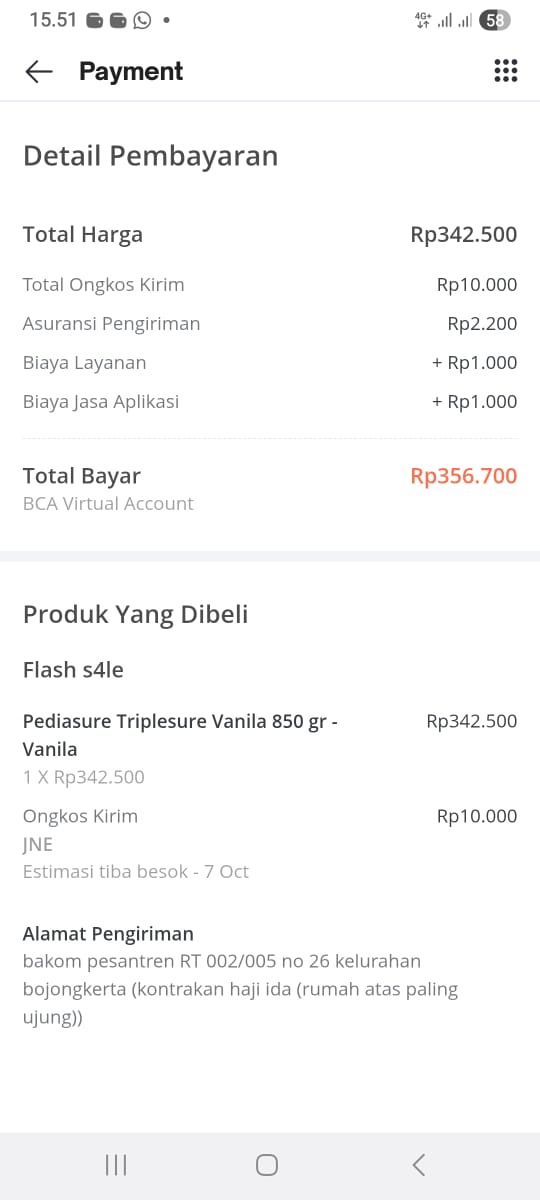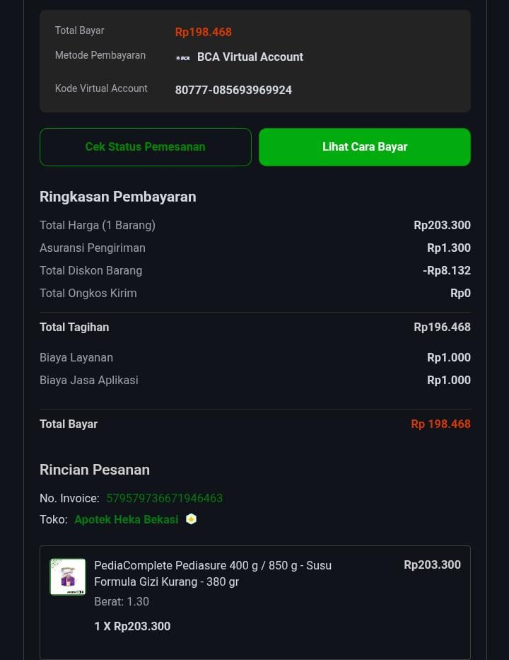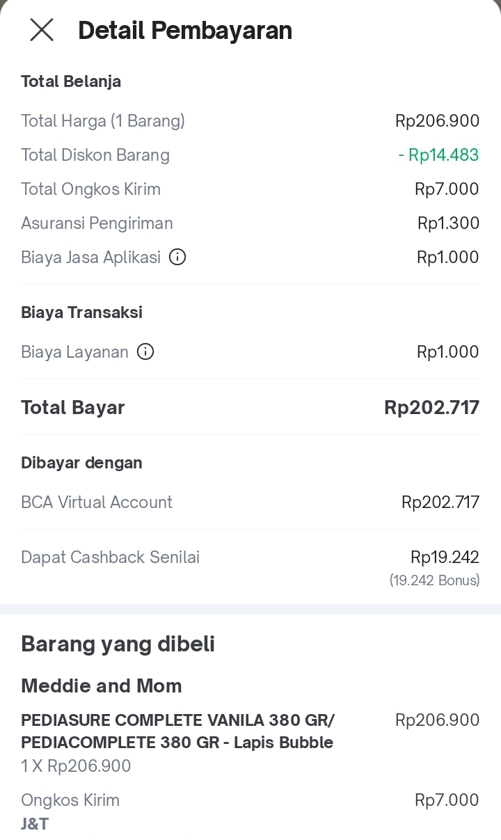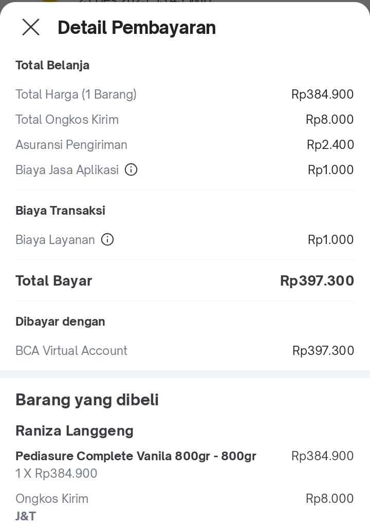Dana digunakan untuk 1.Susu pediasure 200 gram Rp190.000 2.Diapers mamy poko L 28 Rp50.000 3.Tisu basah Rp20.0002025-07-11 10:18:44