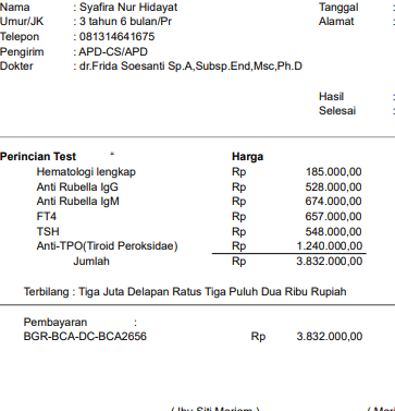 Halo #TemanBaik, alhamdulillah Syafira baru saja menjalani pemeriksaan darah di laboratorium untuk mendeteksi kemungkinan adanya infeksi atau virus dalam tubuhnya. Hasil pemeriksaan ini akan langsung diserahkan ke dokter spesialis endokrinologi di RS Cipto Mangunkusumo sebagai bagian dari proses diagnosis dan pengobatan lanjutan.