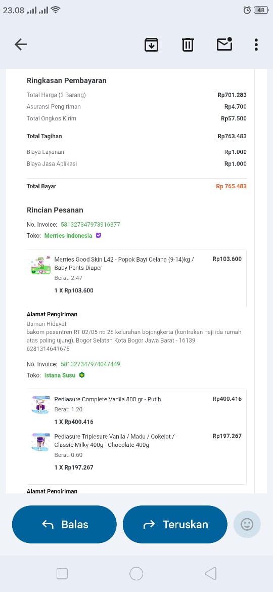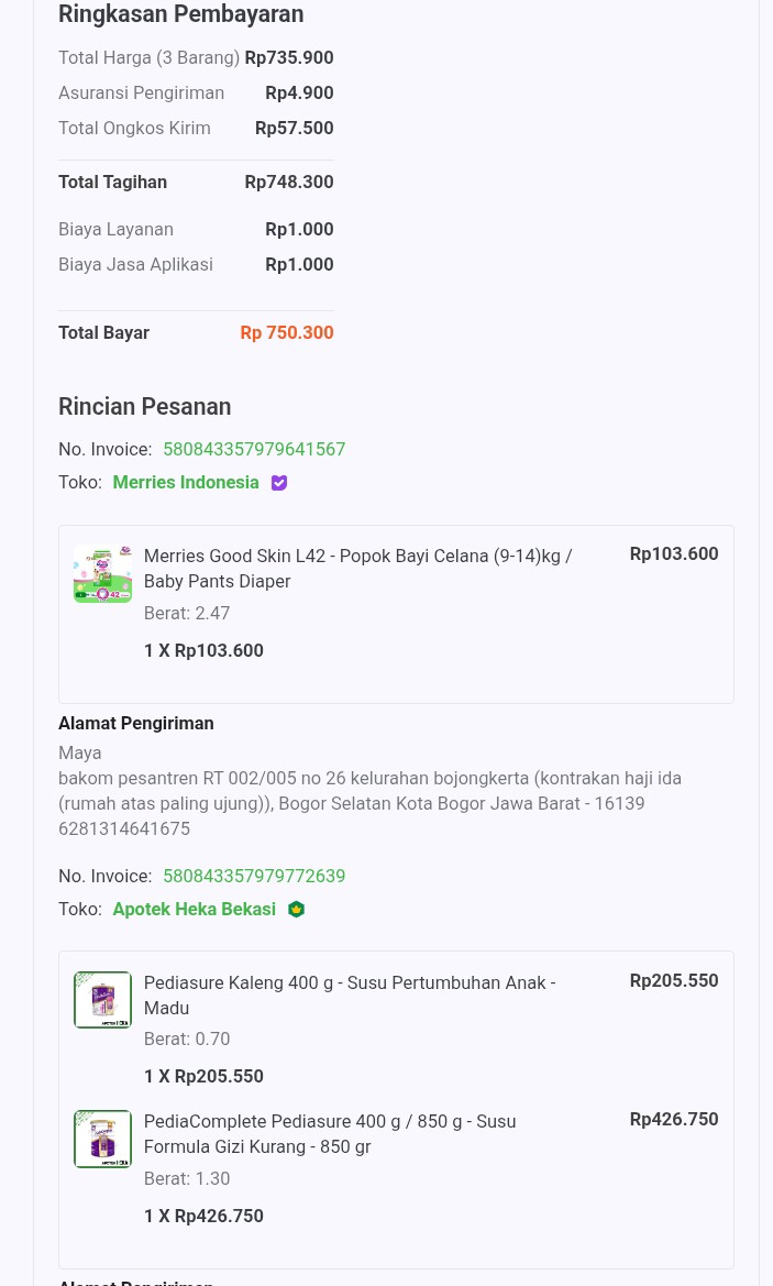 Dana digunakan untuk 1. Susu pediacomplete ukuran 380 gr Rp450.000 2. Susu pediasure ukuran 200 gr Rp200.000 3 . Merries L 42 Rp100.0002025-10-22 09:27:43