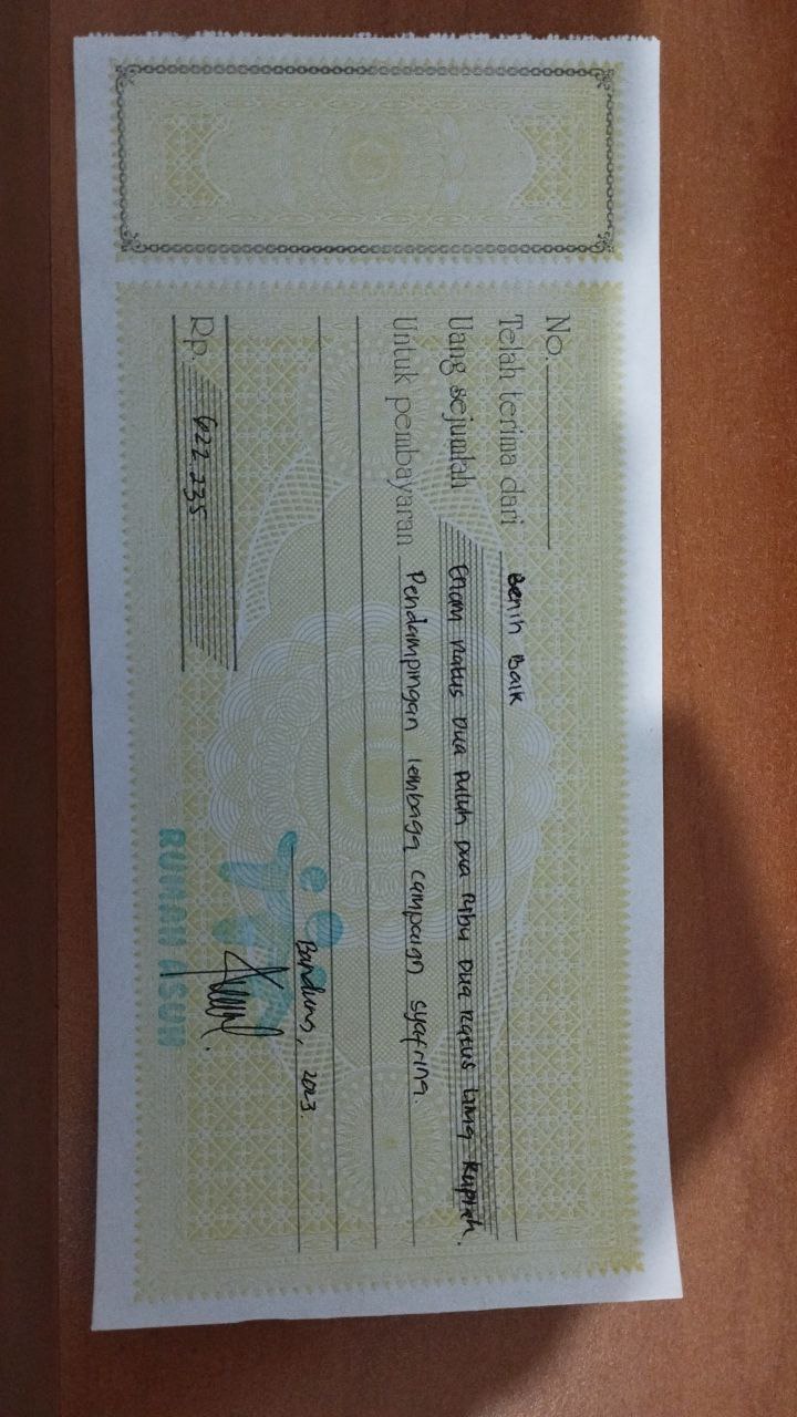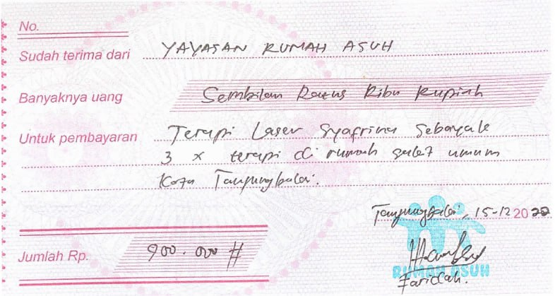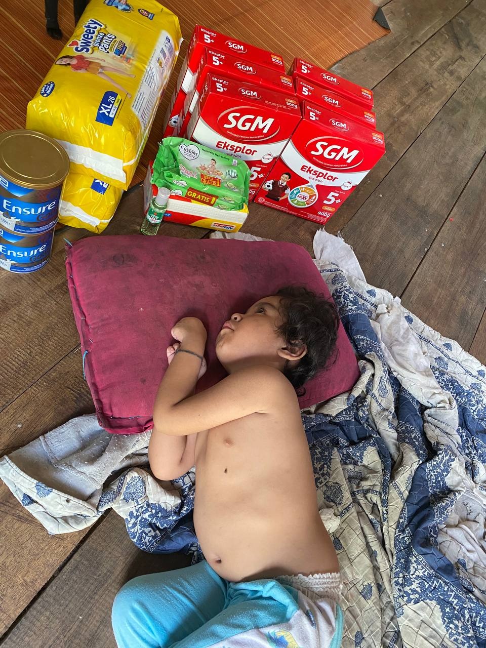 Dana digunakan untuk: 1. Susu SGM 5+ 10 kotak @98.000 Rp980.000 2. Biaya terapi @300.000 2 kali Rp600.000 3. Pampers Mamypoko XL @87.000 5 ball Rp435.000 4. Minyak Kayu Putih 2 pcs @60.000 Rp120.000 5. Tisu Paseo kering dan basah 5 pcs @33.000 Rp165.000 6. Sembako 1 paket Rp.500.000 7. Biaya transportasi 2 PP Rp200.000 8. Biaya operasional lembaga (pendampingan dan admin bank 3.500) Rp532.912.2022-10-12 17:04:55