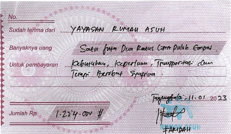 Dana digunakan untuk 1. Susu SGM 5+ 98.000 x 7 kotak= Rp686.000 2. Biaya terapi 300.000 x 4 kali= Rp1.200.000 3. Pampers Mamypoko XL 87.000 x 4 ball= Rp348.000 4. Minyak kayu putih 60.000 x 4 pcs= Rp240.000 5. Tisu kering dan basah 33.000 x 4 pcs= Rp132.000 6. Biaya transportasi becak motor untuk pengobatan dari Sipori-Pori ke RS Umum Tanjungbalai 100.000 x 4 kali PP= Rp400.000 7. Biaya operasional relawan selama penyaluran 236.000 x 2 bulan= Rp472.000 8. Biaya operasional pendampingan2023-01-20 17:10:17