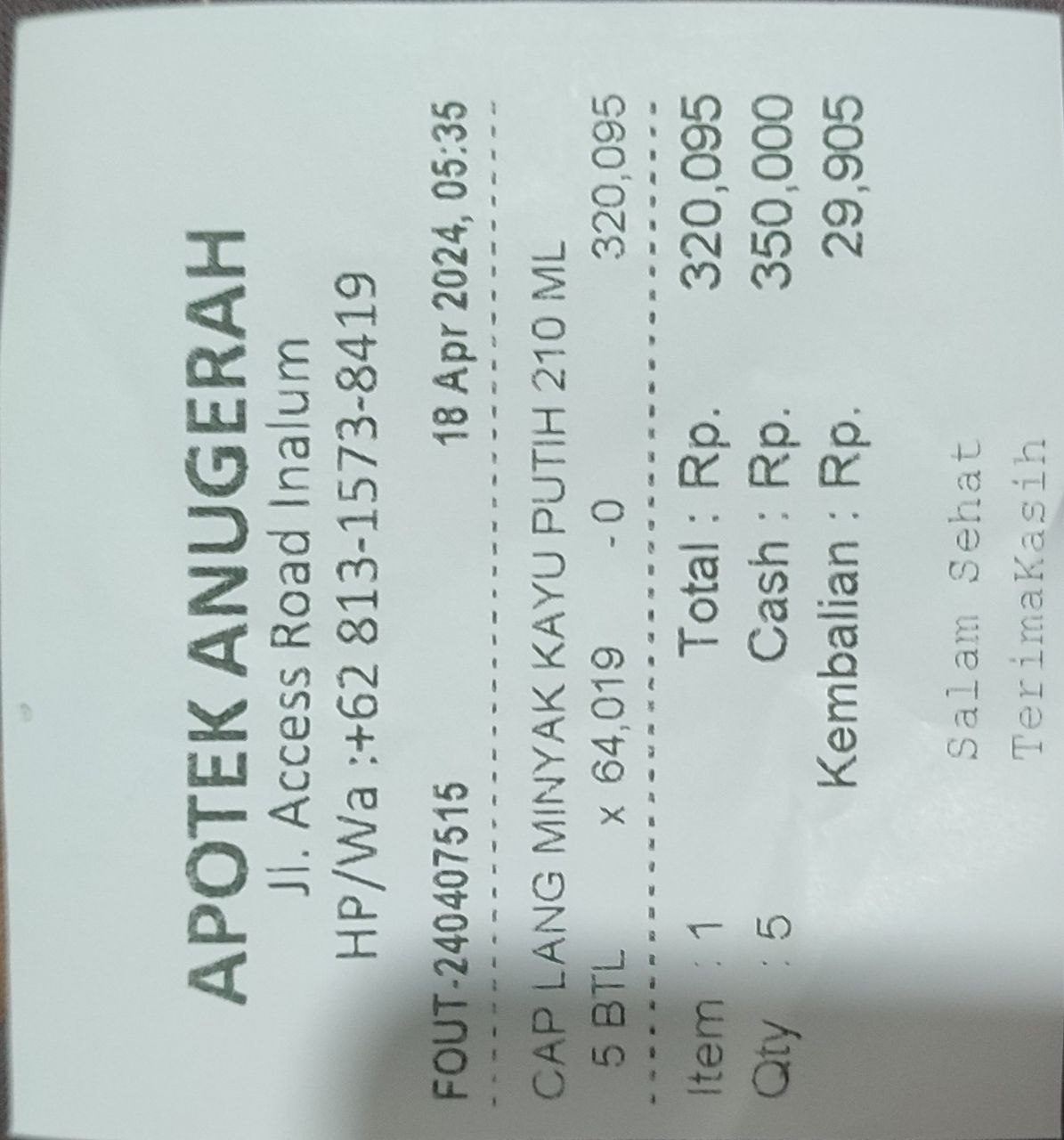 4. Minyak kayu putih 60.000 x 6 pcs= Rp360.000