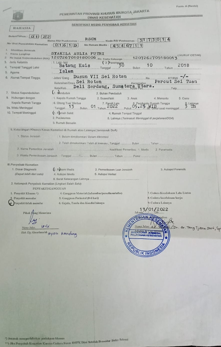 Dengan berat hati kami menyampaikan berita duka yang mendalam atas gugurnya satu pejuang cilik kita, Syakila aulia putri pada tanggal 13 Januari 2022 pukul 05.25 WIB di RSCM.