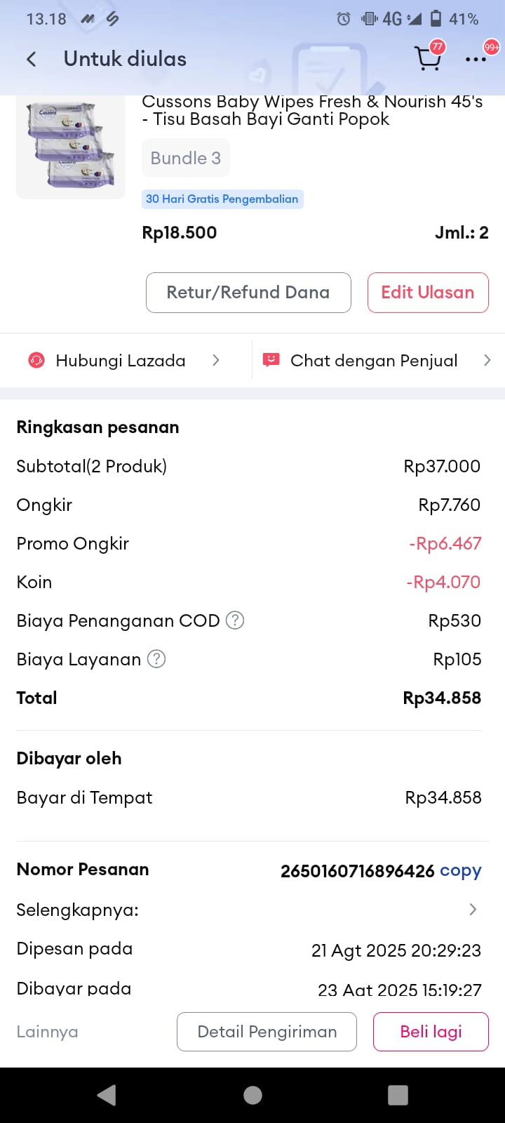Dana digunakan untuk 1. Transportasi online terapi ke RS pp Rp130.000 x 2 kali = Rp260.000 2. Pampers baby happy Rp50.000 x 6ball = Rp300.000 3. Tissue basah Rp18.500 x 2pcs = Rp37.000 4. Tissue kering Rp37.0002025-08-21 09:22:45