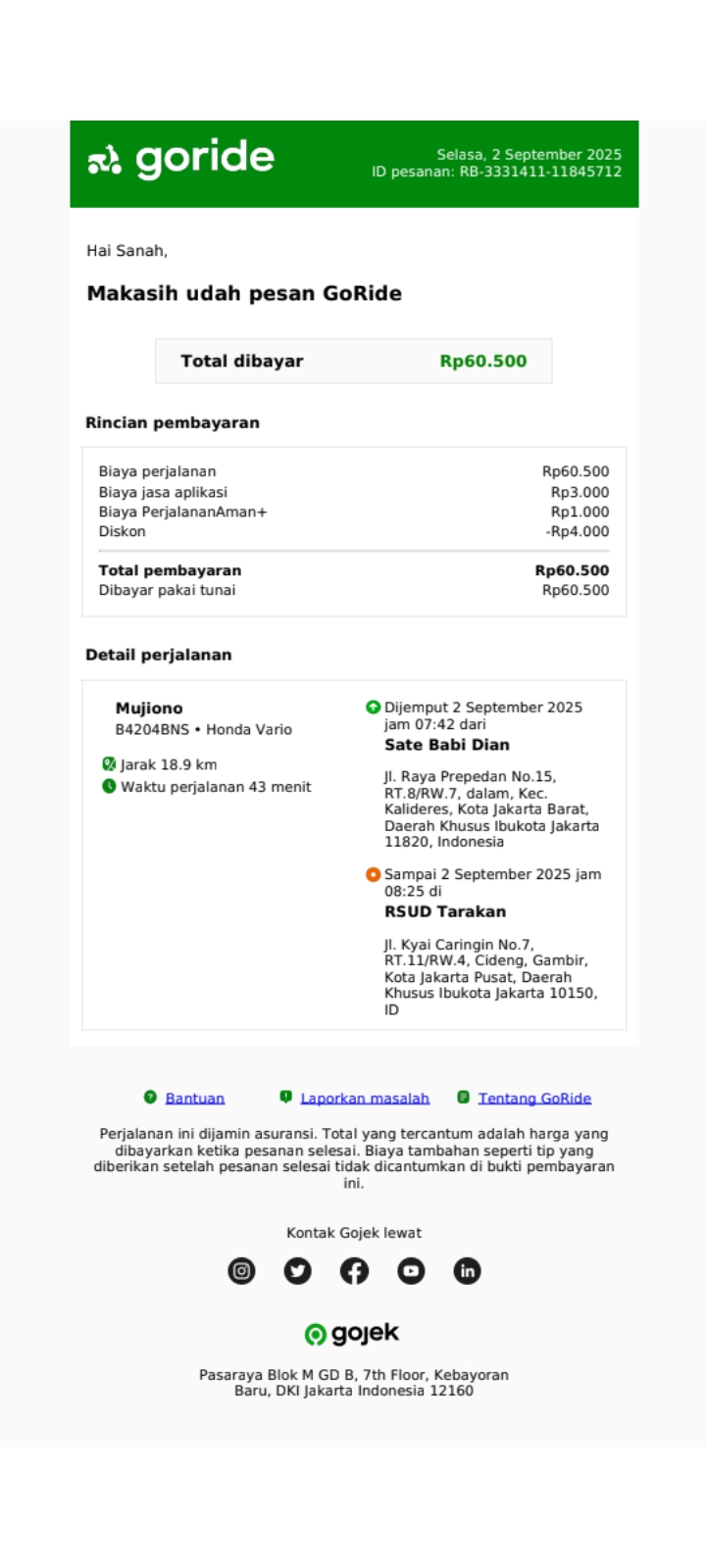 Dana digunakan untuk 1. Transportasi online terapi ke rs pp Rp130.000 2. Susu vidorant Rp52.000 x 4dus= Rp208.0002025-05-19 14:17:45