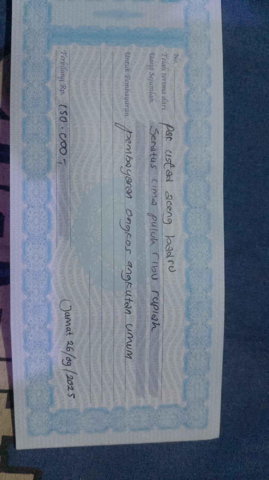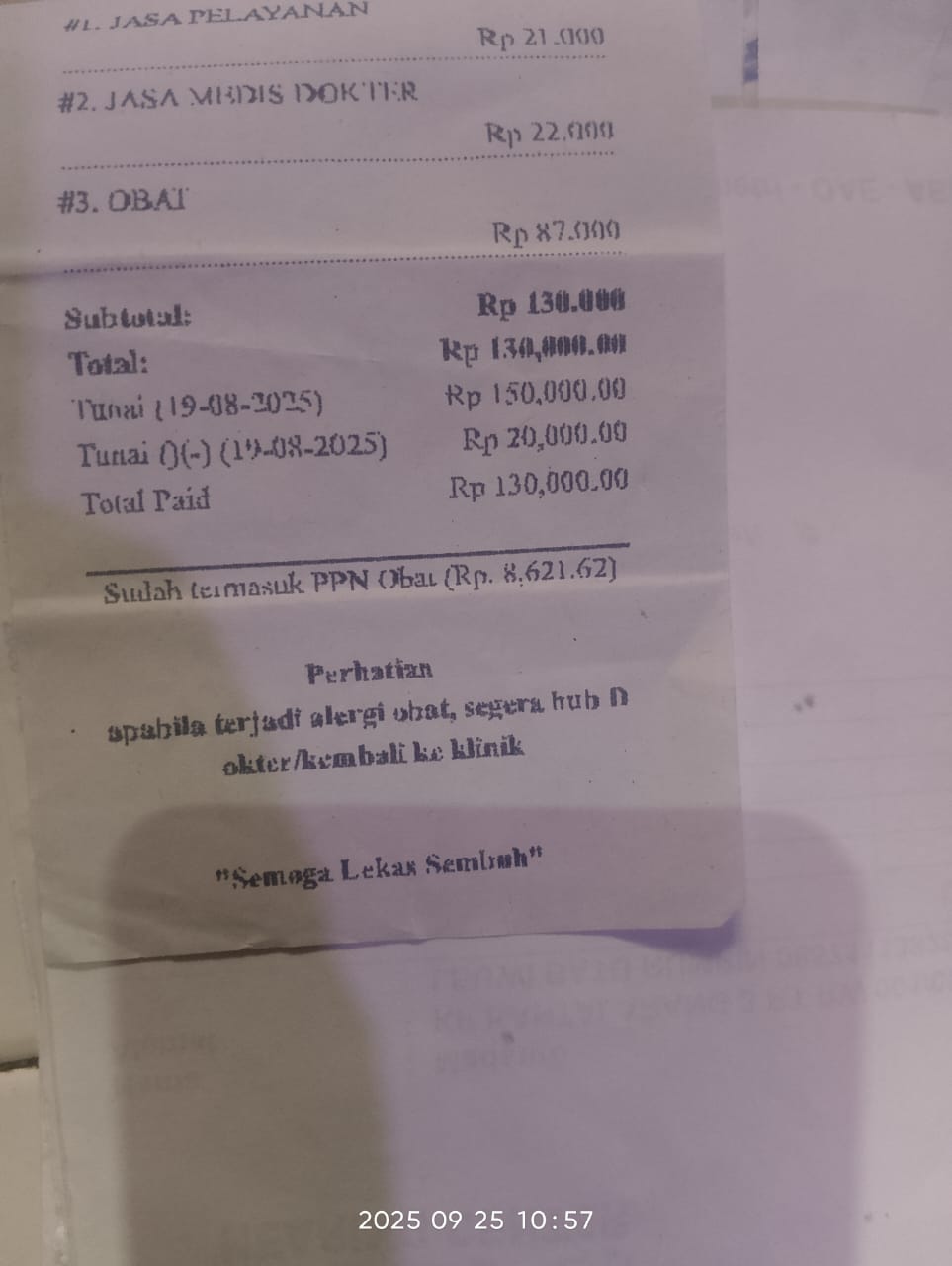 Dana digunakan untuk 1. Transportasi angkutan umum pulang pergi RSUD kota bogor Rp.50.000 2. Clobazam 10mg Rp80.000x2 = Rp160.000 3. Meloxicam 15mg Rp83.000 4. Diazetpam 5mg Rp187.0002025-10-10 10:48:50