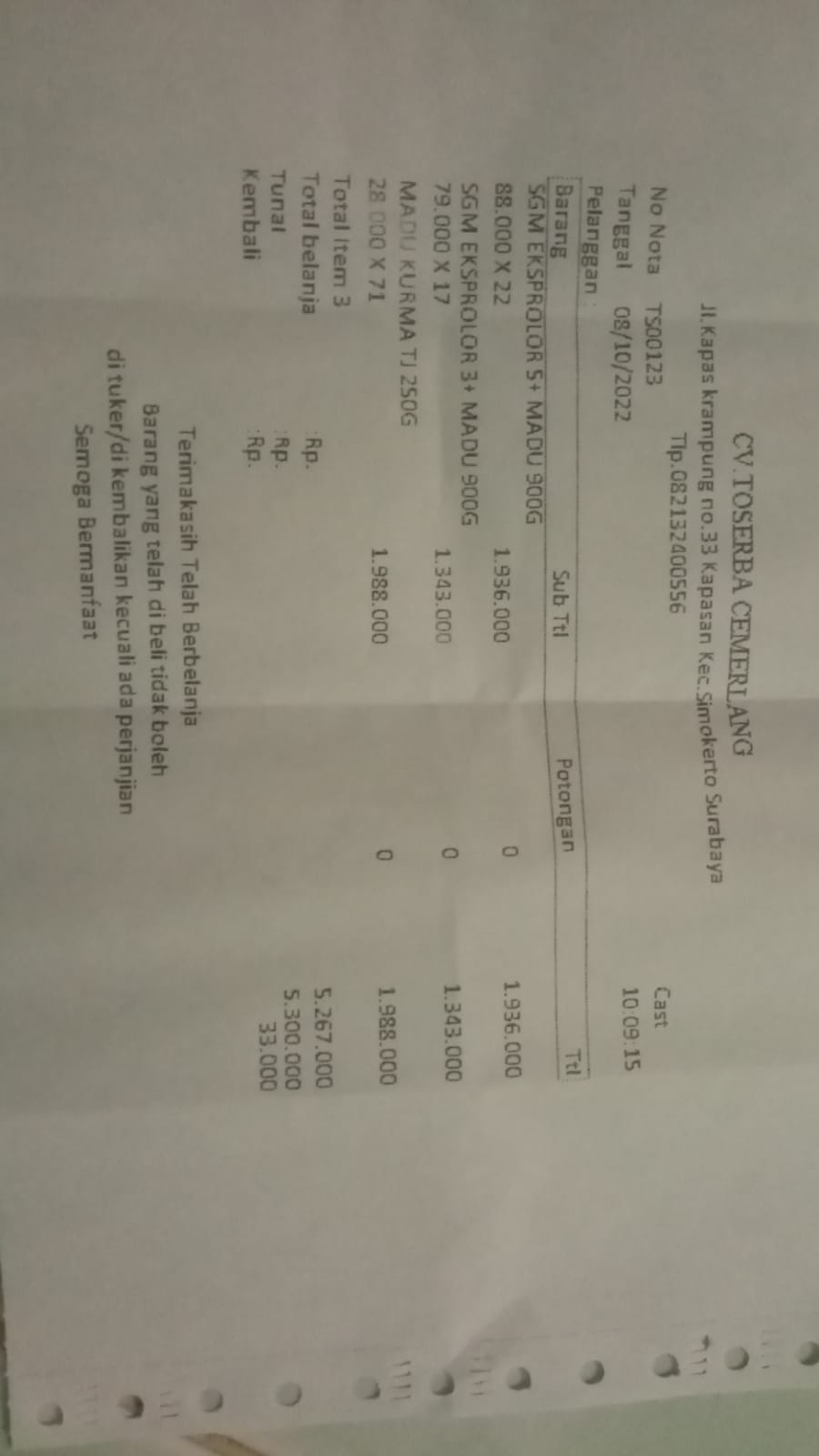 Dana Digunakan Untuk: -Pembelian 17 box Propoelix @609.000 -Pembelian susu 20 dus SGM 5+ @98.0000 dan 17 dus SGM 3+ @75.000 -Pembelian Madu Kurma TJ 70 botol @28.5002022-08-18 17:21:47
